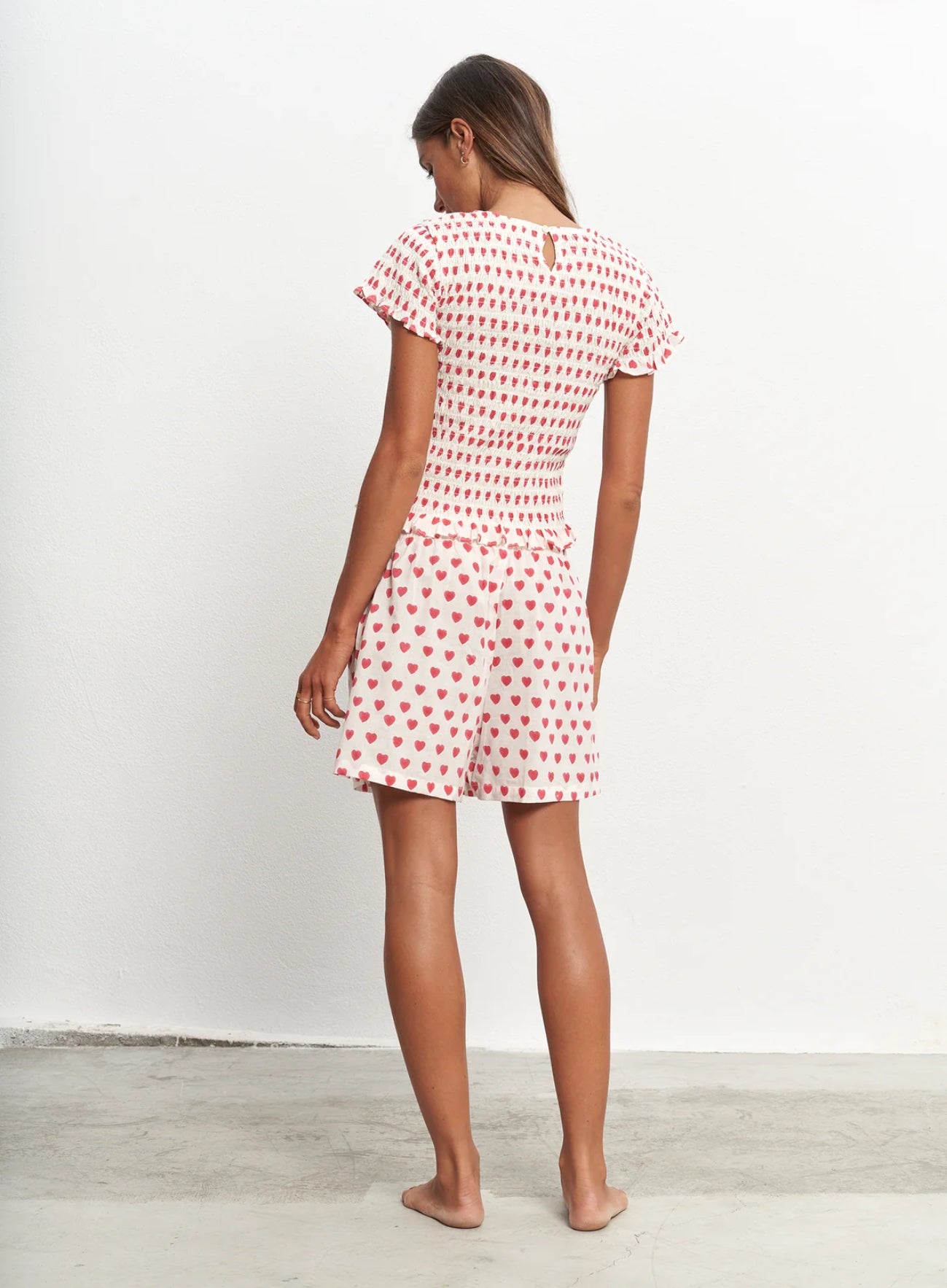 Pantalón corto con goma en cintura tipo bóxer con estampado Block Print de corazones en rojo con tintes naturales.