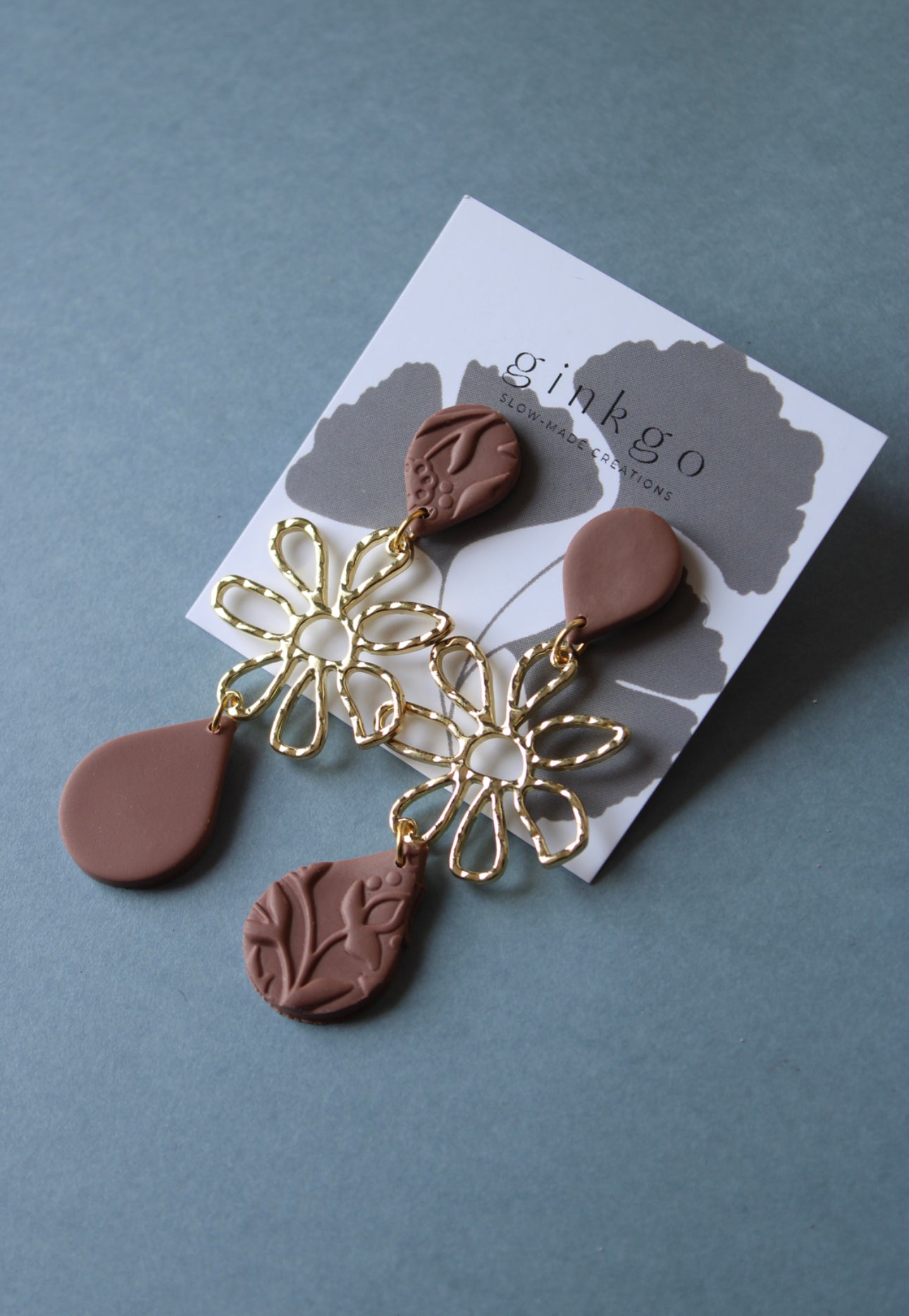 Hechos de arcilla polimérica con texturas florales y apliques de acero inoxidable.