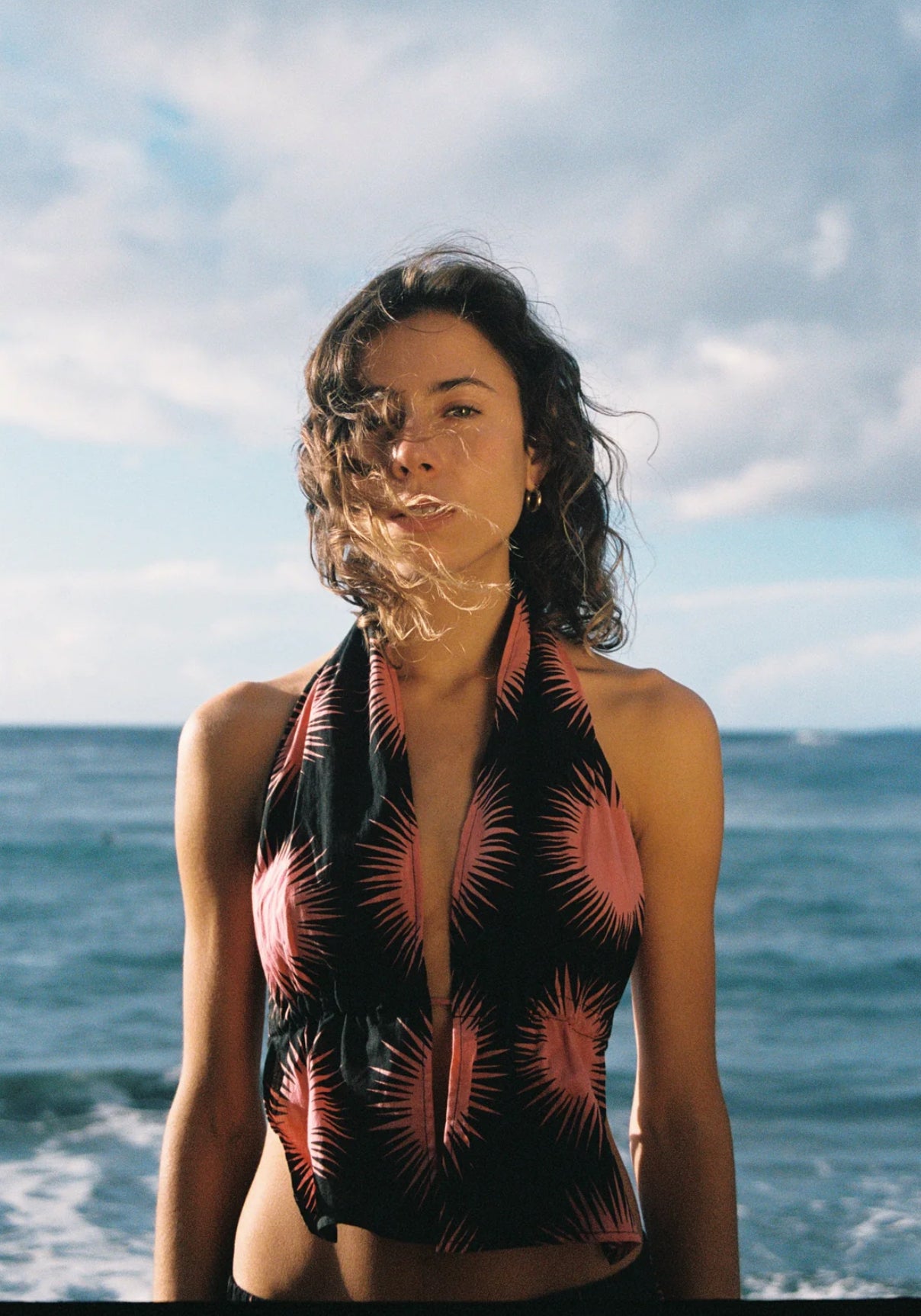 Top con espalda descubierta con tira ajustable en cintura con estampado blockprint de soles rosas con base negra