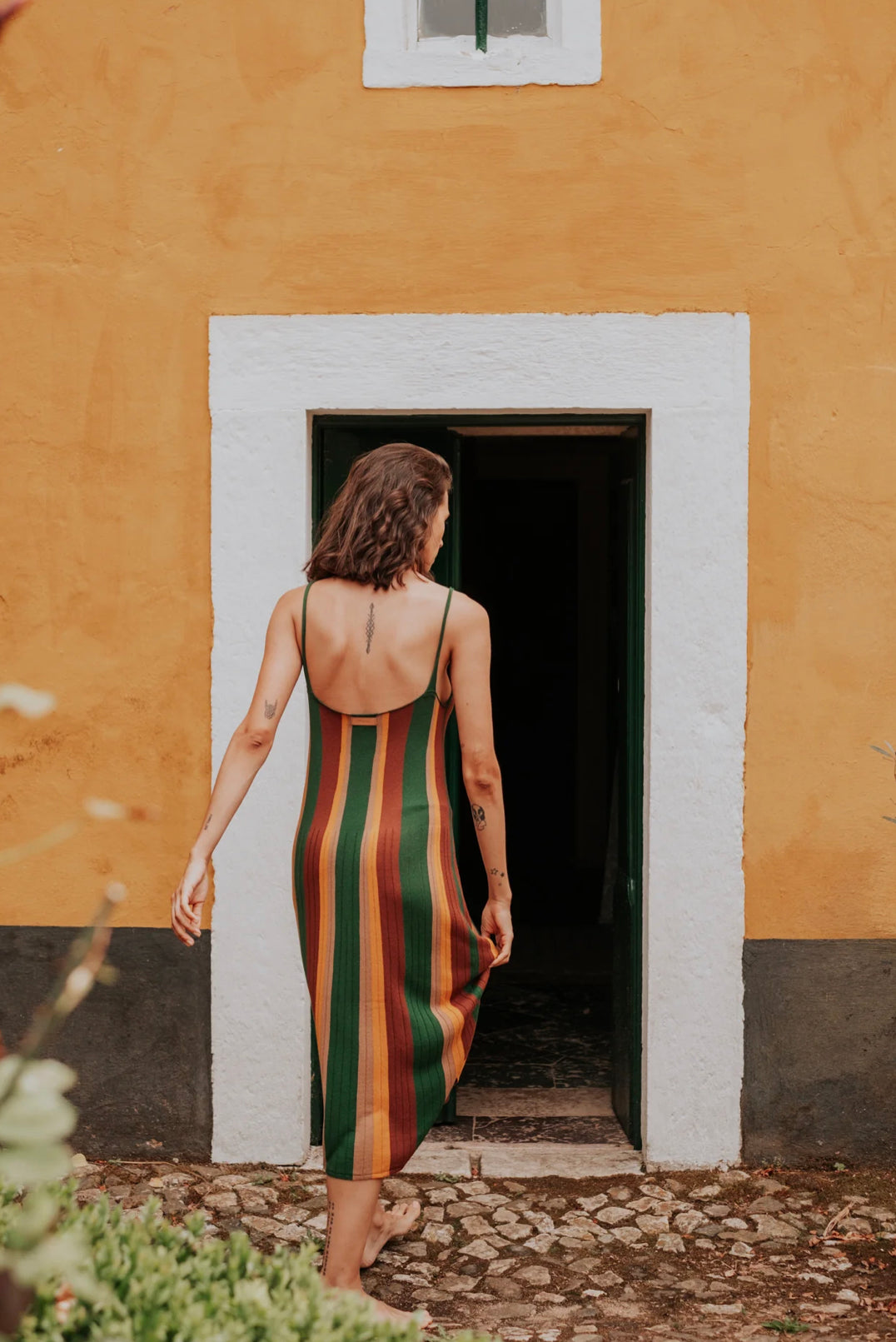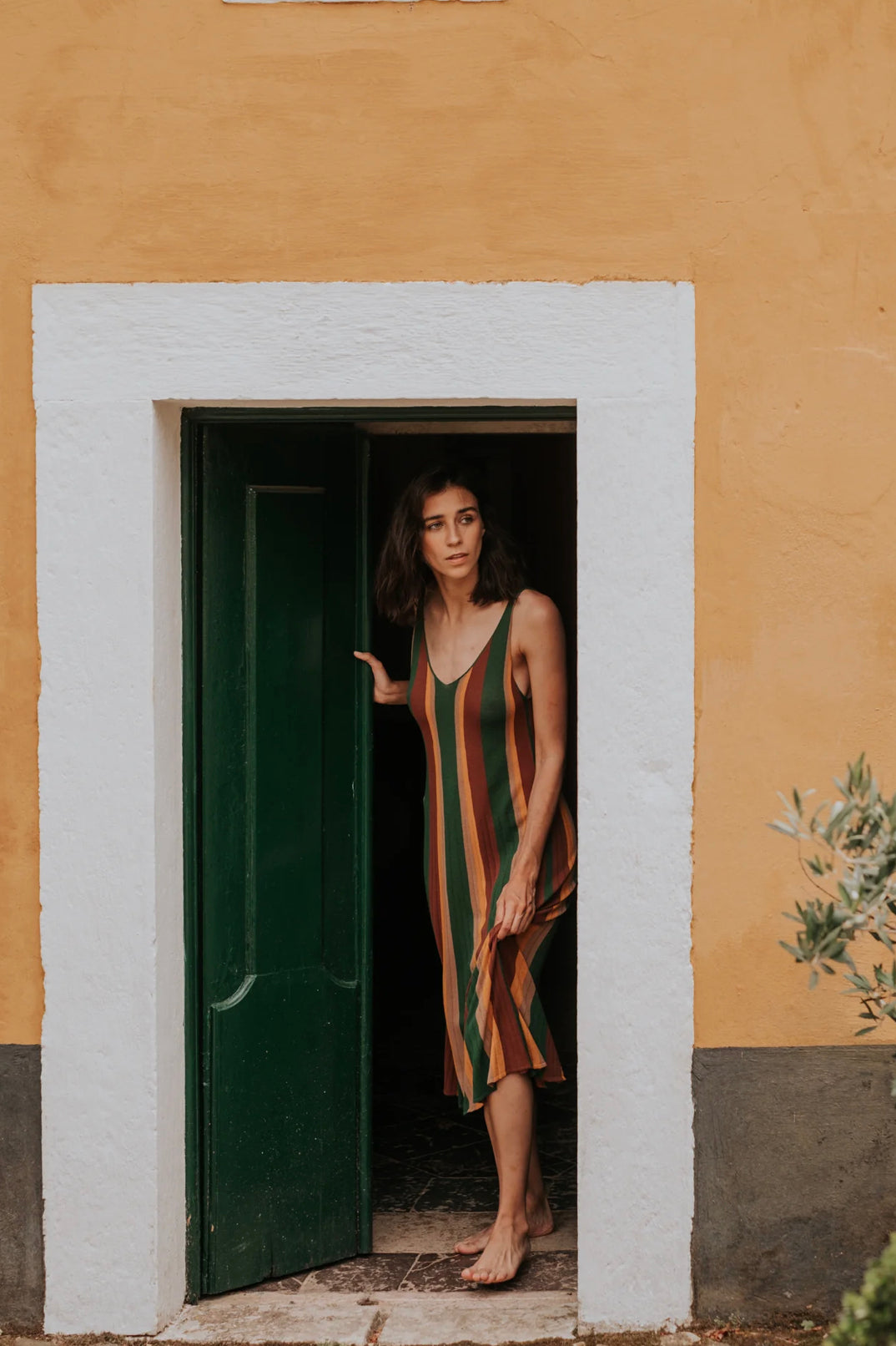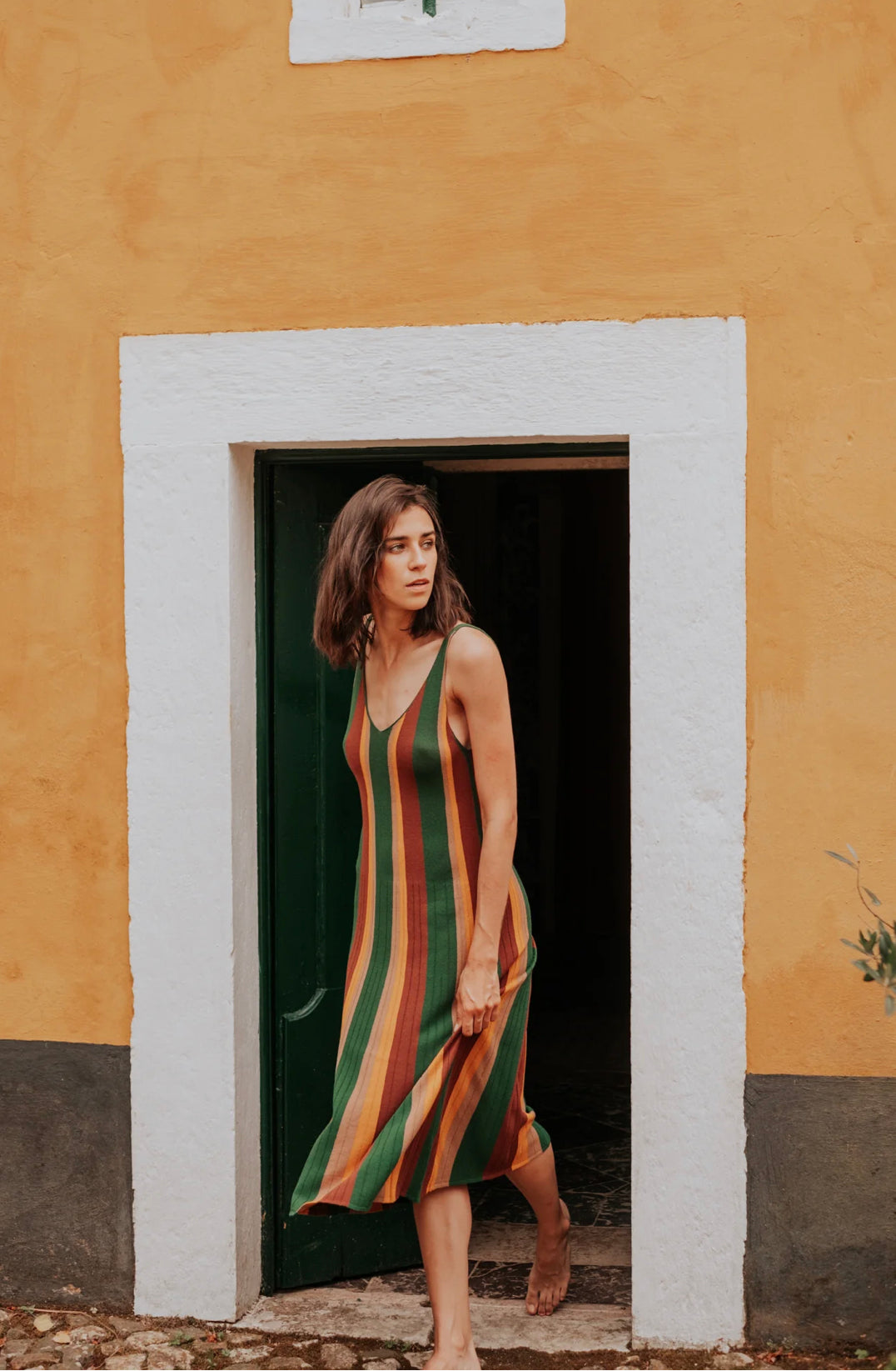Riscas coloridas dão vida ao seu novo vestido favorito do verão. O decote em formato V e o tecido leve garantem o frescor necessário para a estação mais quente do ano.