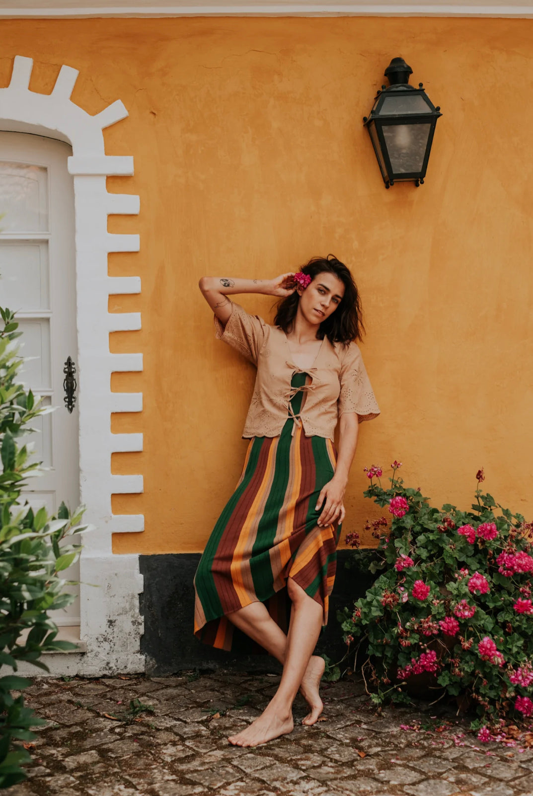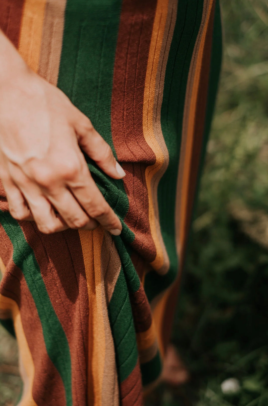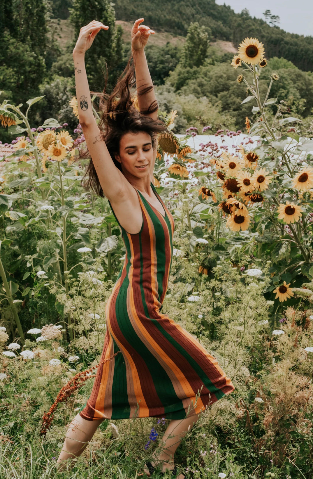 Riscas coloridas dão vida ao seu novo vestido favorito do verão. O decote em formato V e o tecido leve garantem o frescor necessário para a estação mais quente do ano.