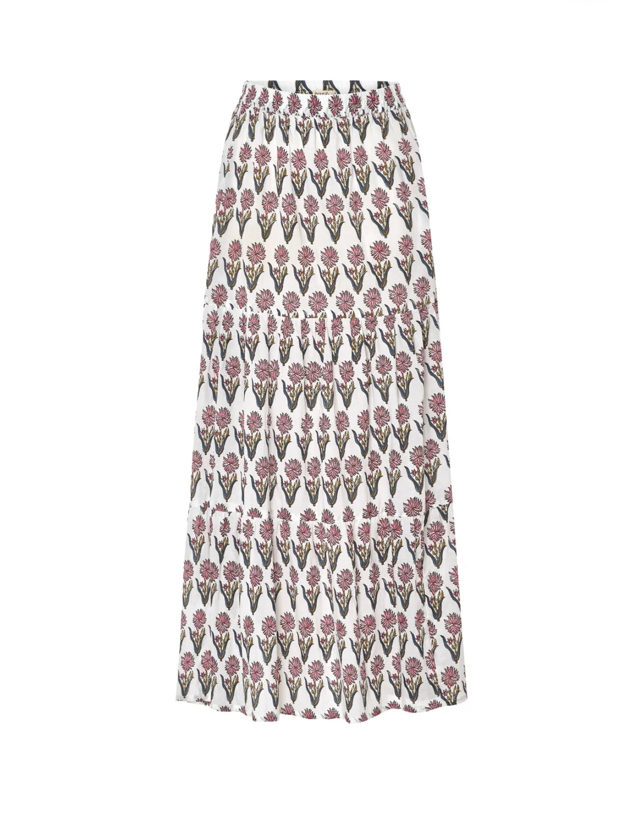 Falda larga con goma en cintura estampado block print de flores rosas y azules con tintes naturales🌺🌼
