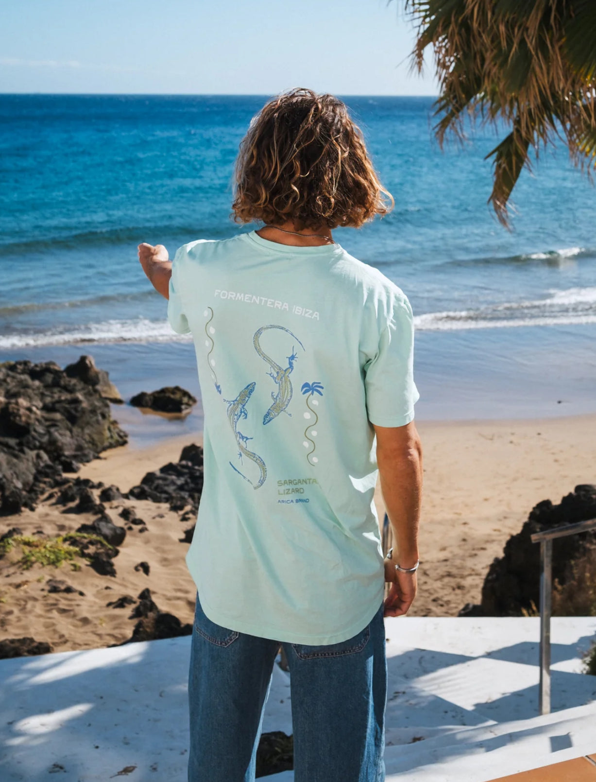 La isla de moda y un paraíso natural. Hemos querido salir del turismo y centrarnos en la fauna y flora de las Islas Pitiusas mostrando una de las especies protegidas más importantes de la zona, la lagartija Sargantana ibicenca. Sus colores van del azul al amarillo y sin duda harán de este diseño uno de los grandes Hits de este verano!
