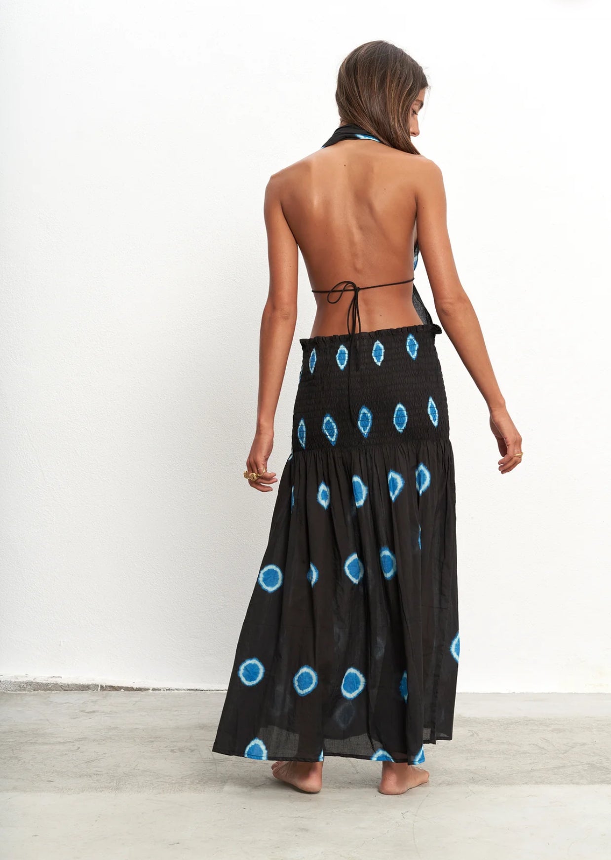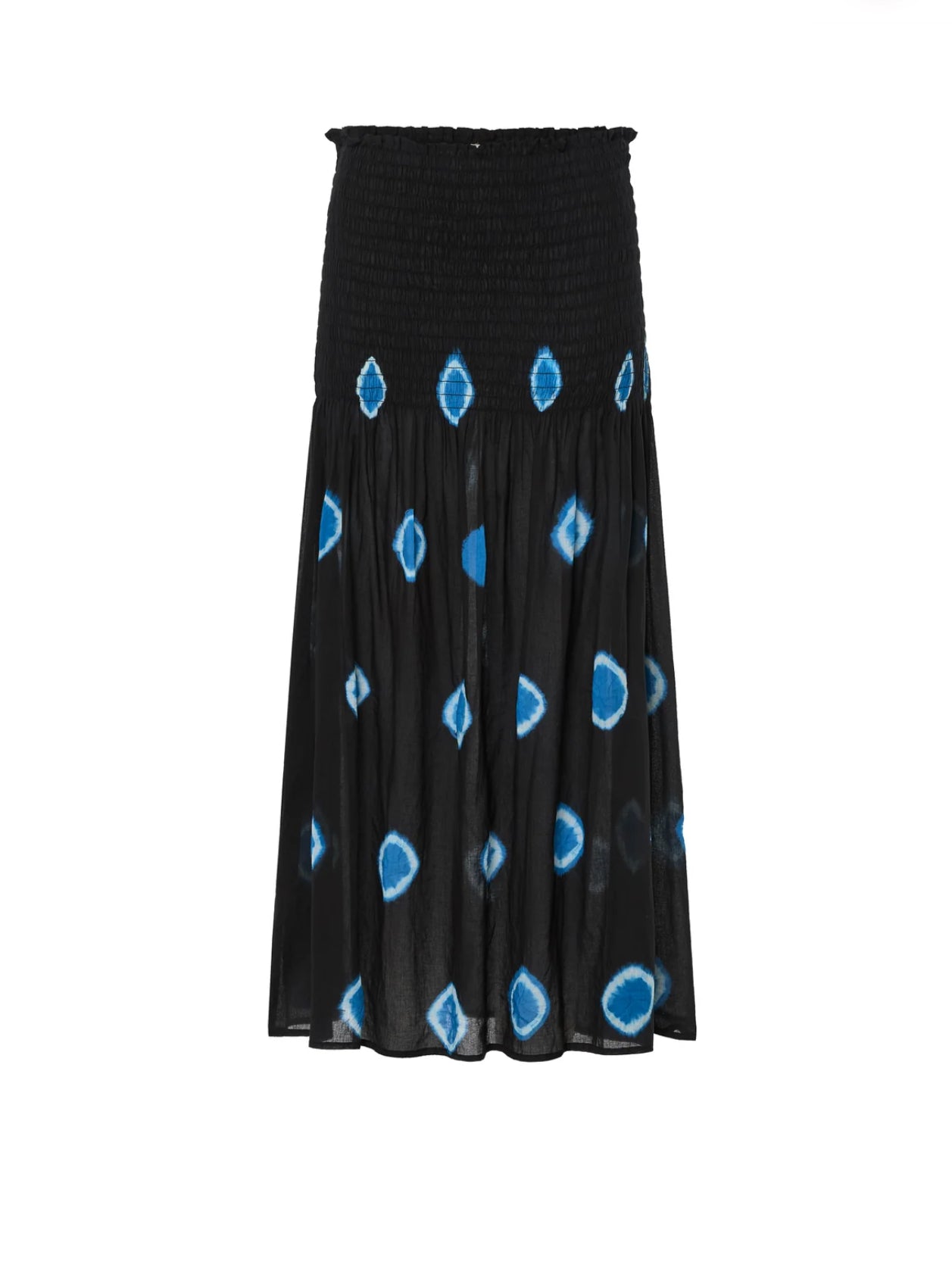 Falda larga con nido de abeja hasta la cadera realizada con la técnica manual de shivory con tintes naturales en color negro con detalles azules🌊