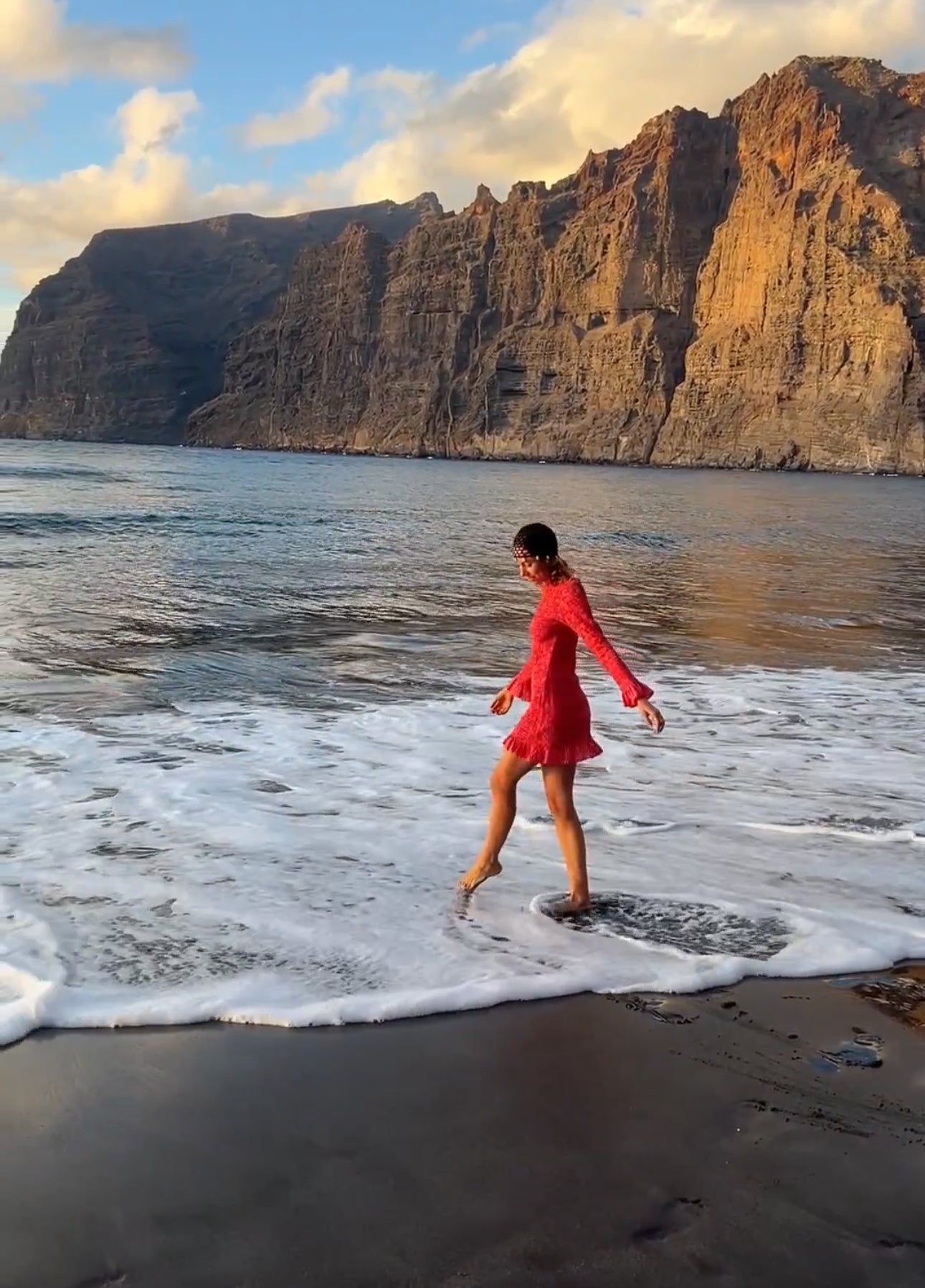 Vestido de manga larga en nido de abeja con estampado block print damero rosas y rojos con tintes naturales 🍒