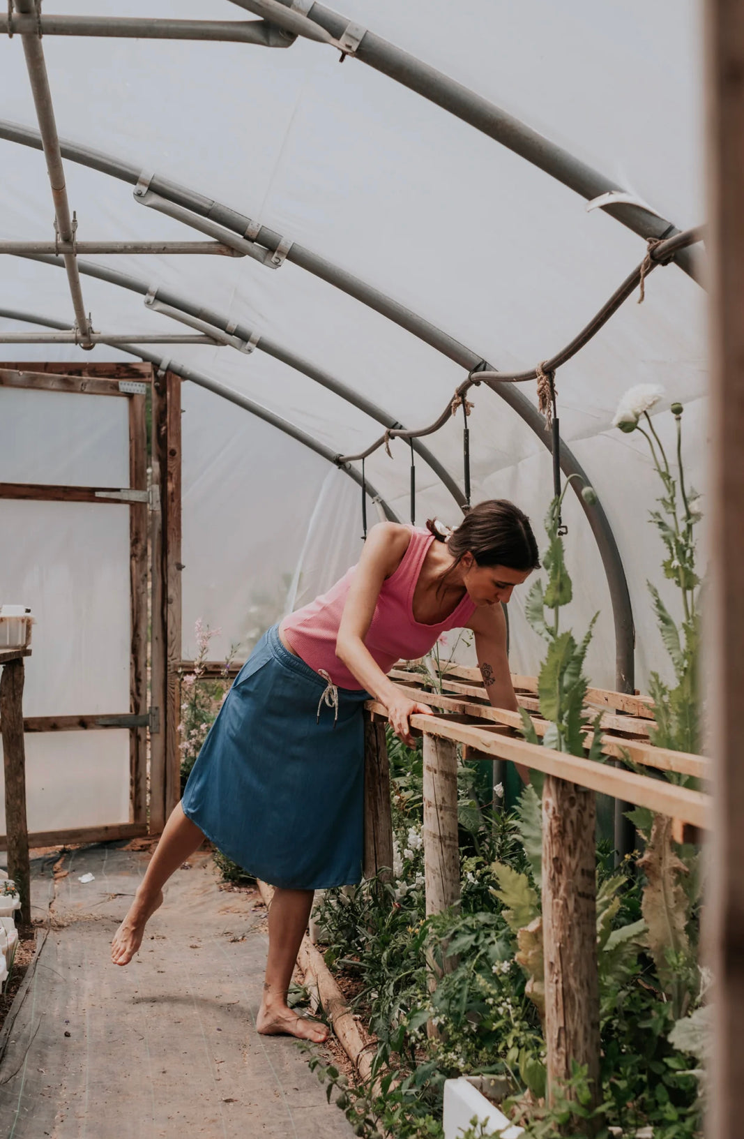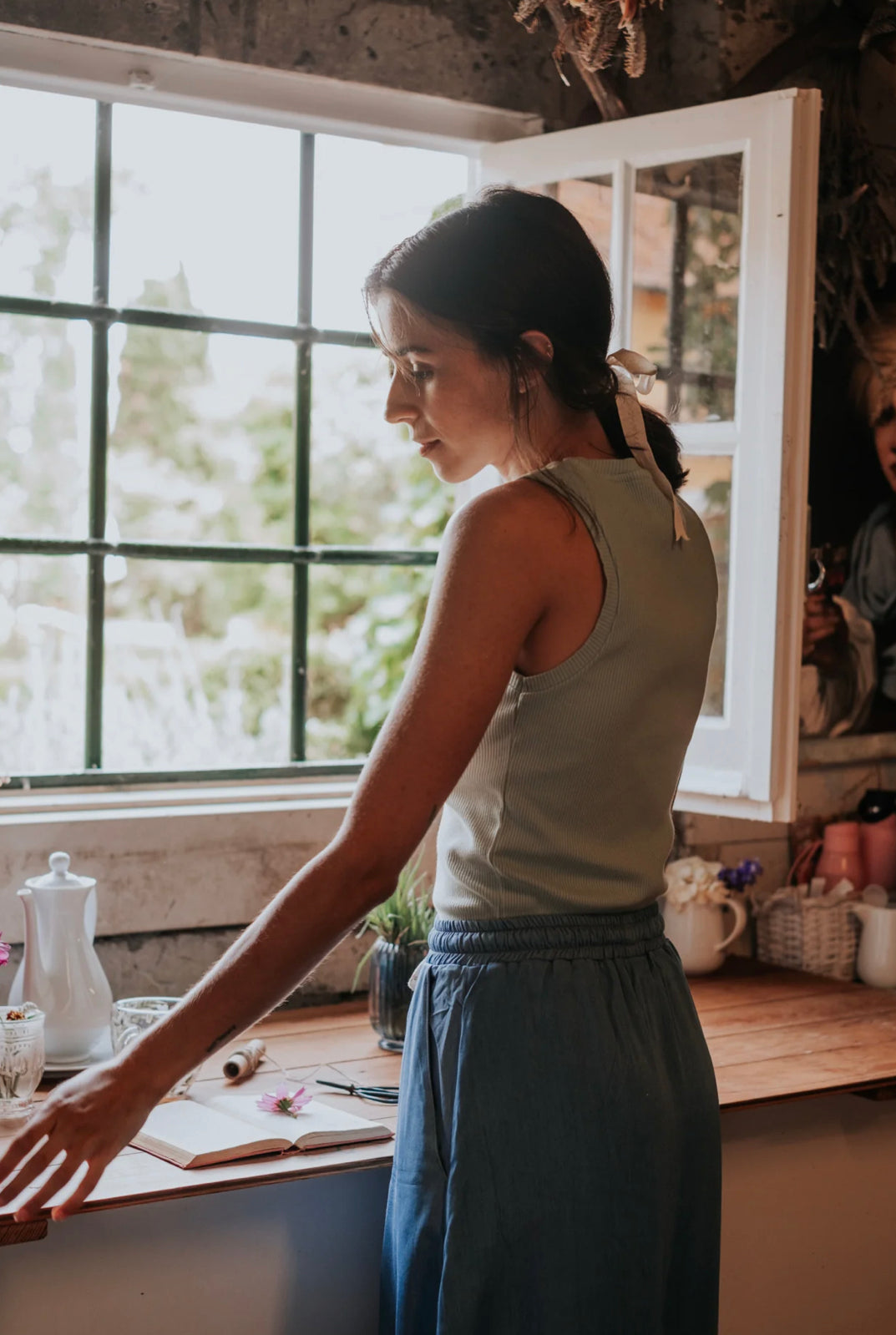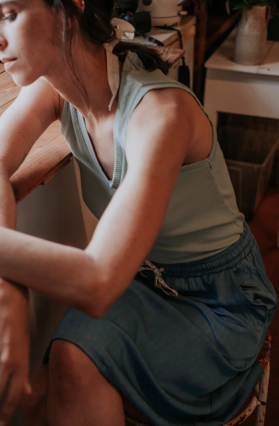 Crea un look minimalista y cómodo con esta falda midi estilo denim.