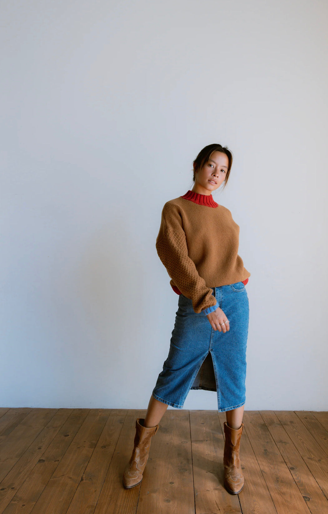 Este sweater es una de esas prendas icónicas de esté capítulo. Los detalles como la mezcla de colores y texturas, los acabados en los puños y el cuello redondo convierten esta pieza en un todo para estilizar cualquier look y armonizar tus días.