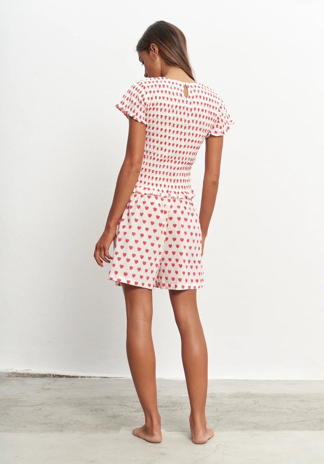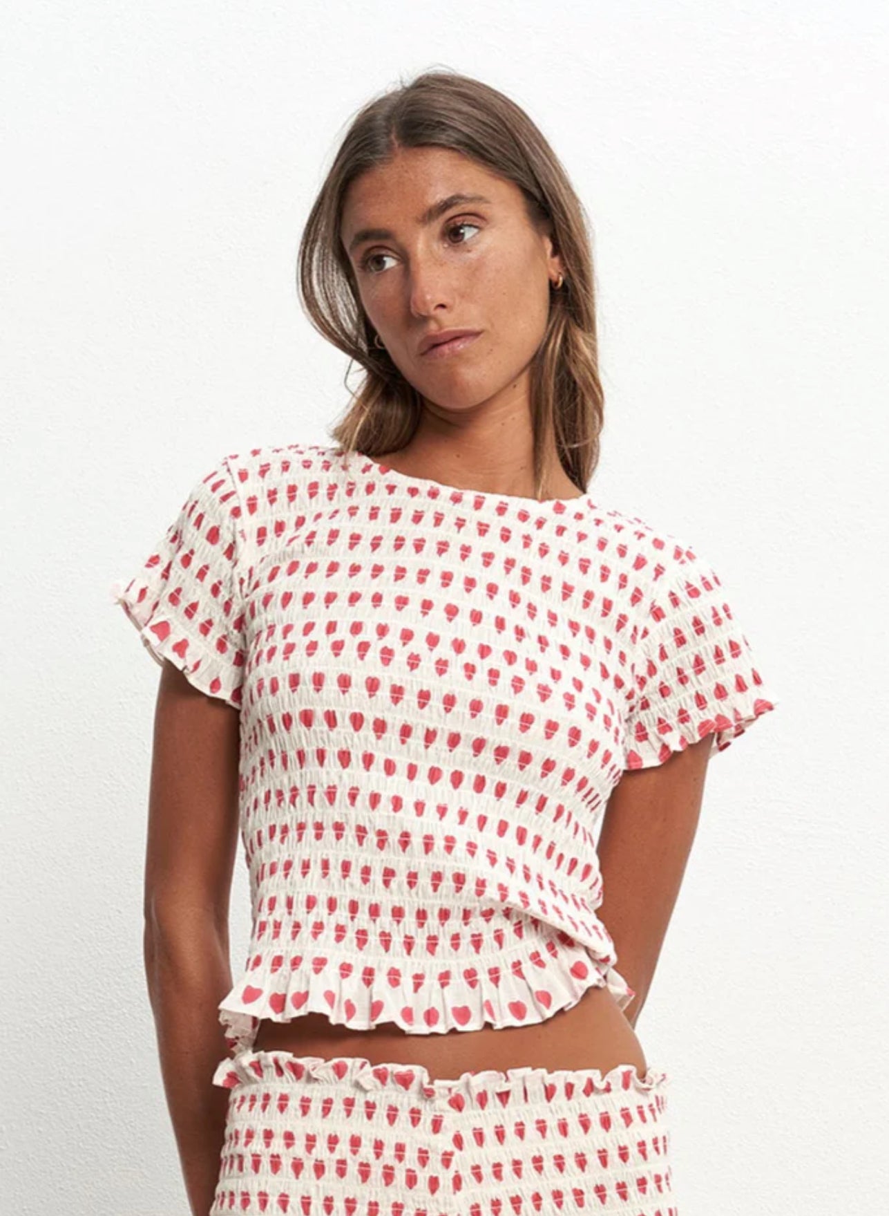 Camiseta manga corta con nido de abeja y volantes en bajo con estampado block print de corazones rojos con tintes naturales❤️