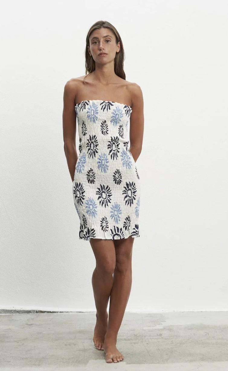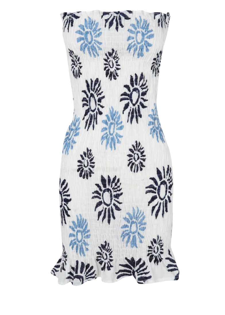 Estampado Block Print de soles en tonos azules con tintes naturales.