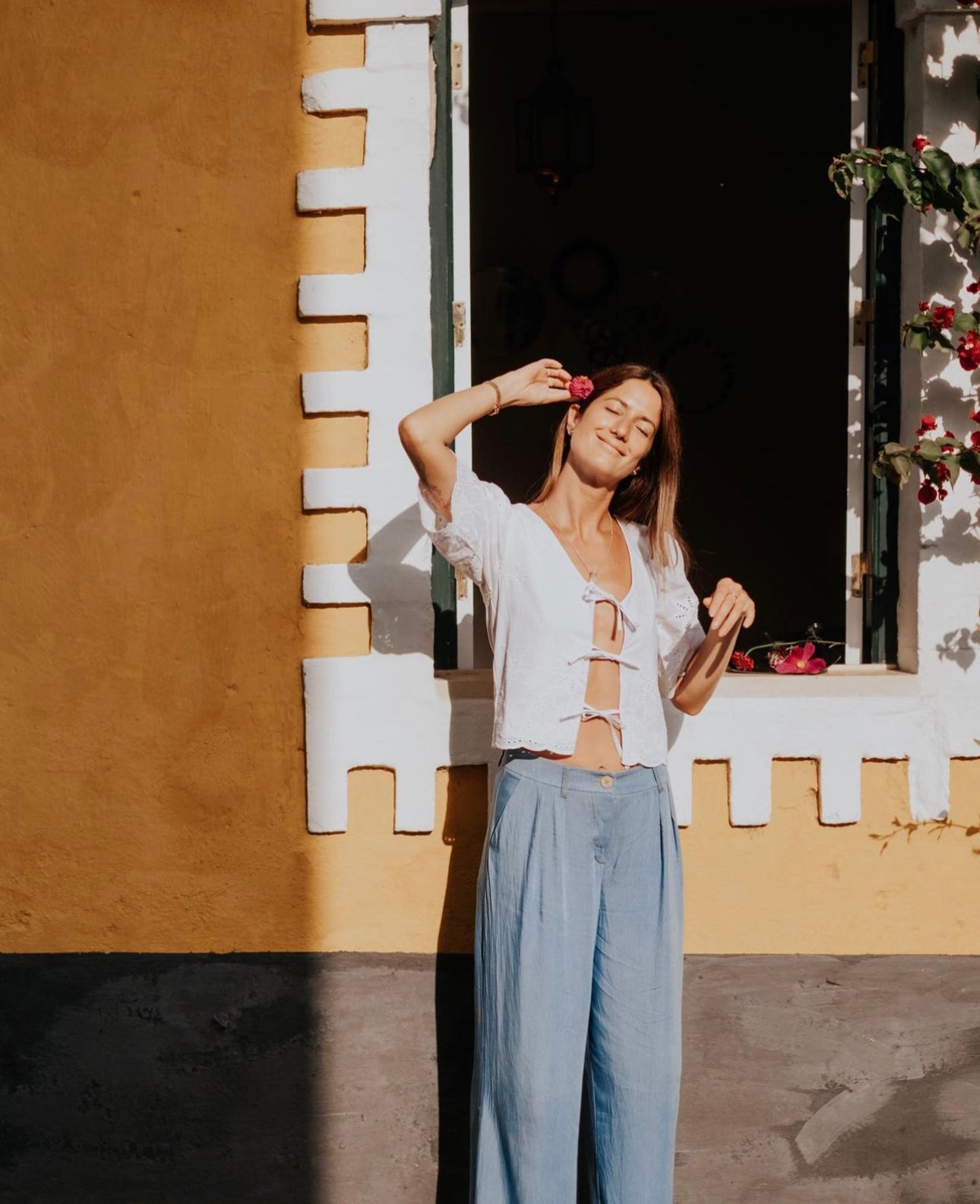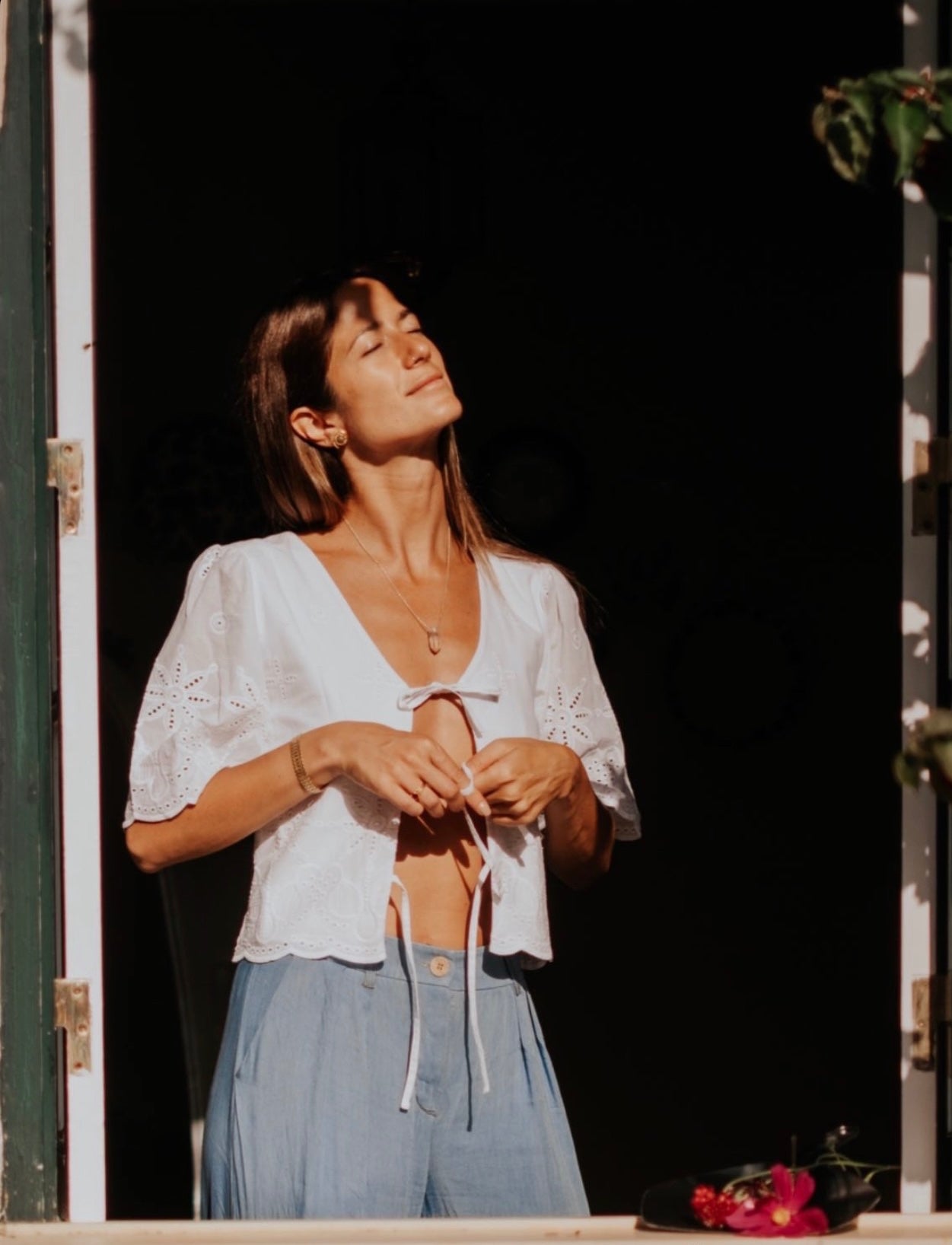 Está confeccionada con algodón 100% orgánico y por su bordado inglés; destaca por las siluetas florales y está unida por lazos que cierran la blusa.