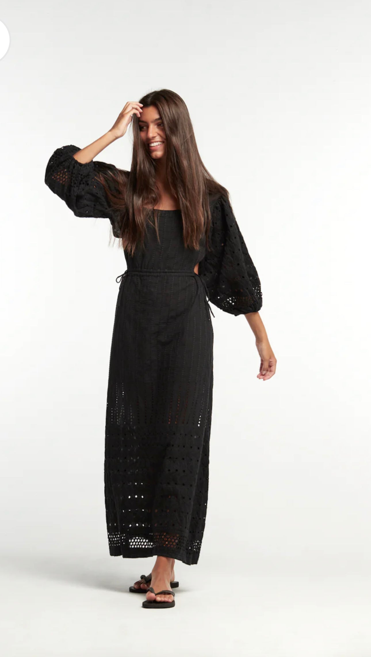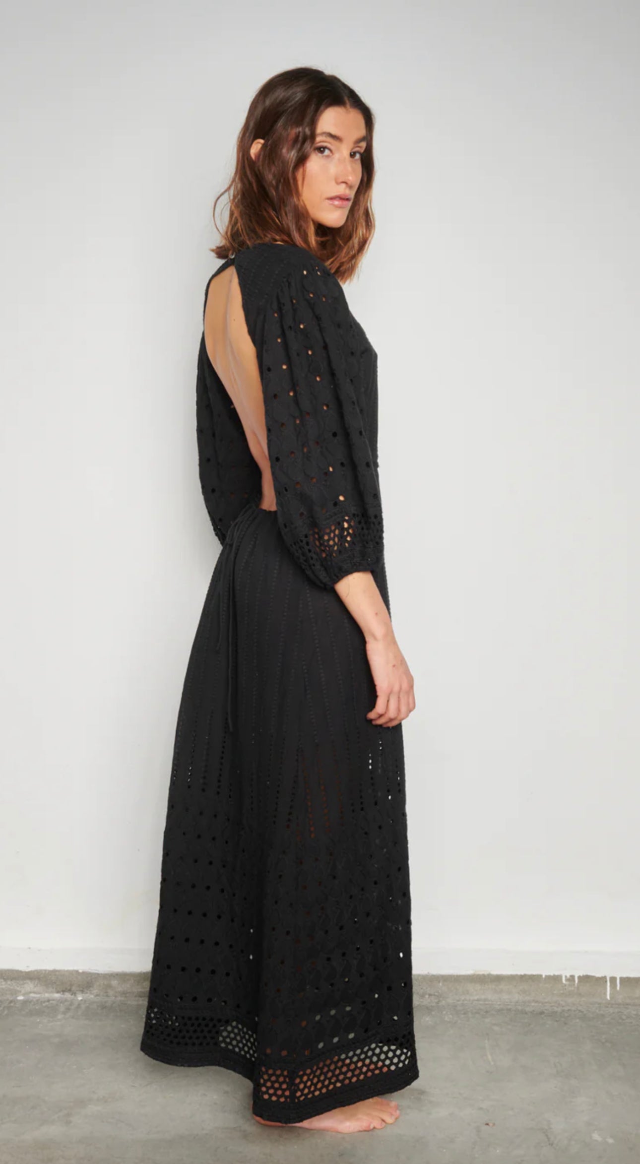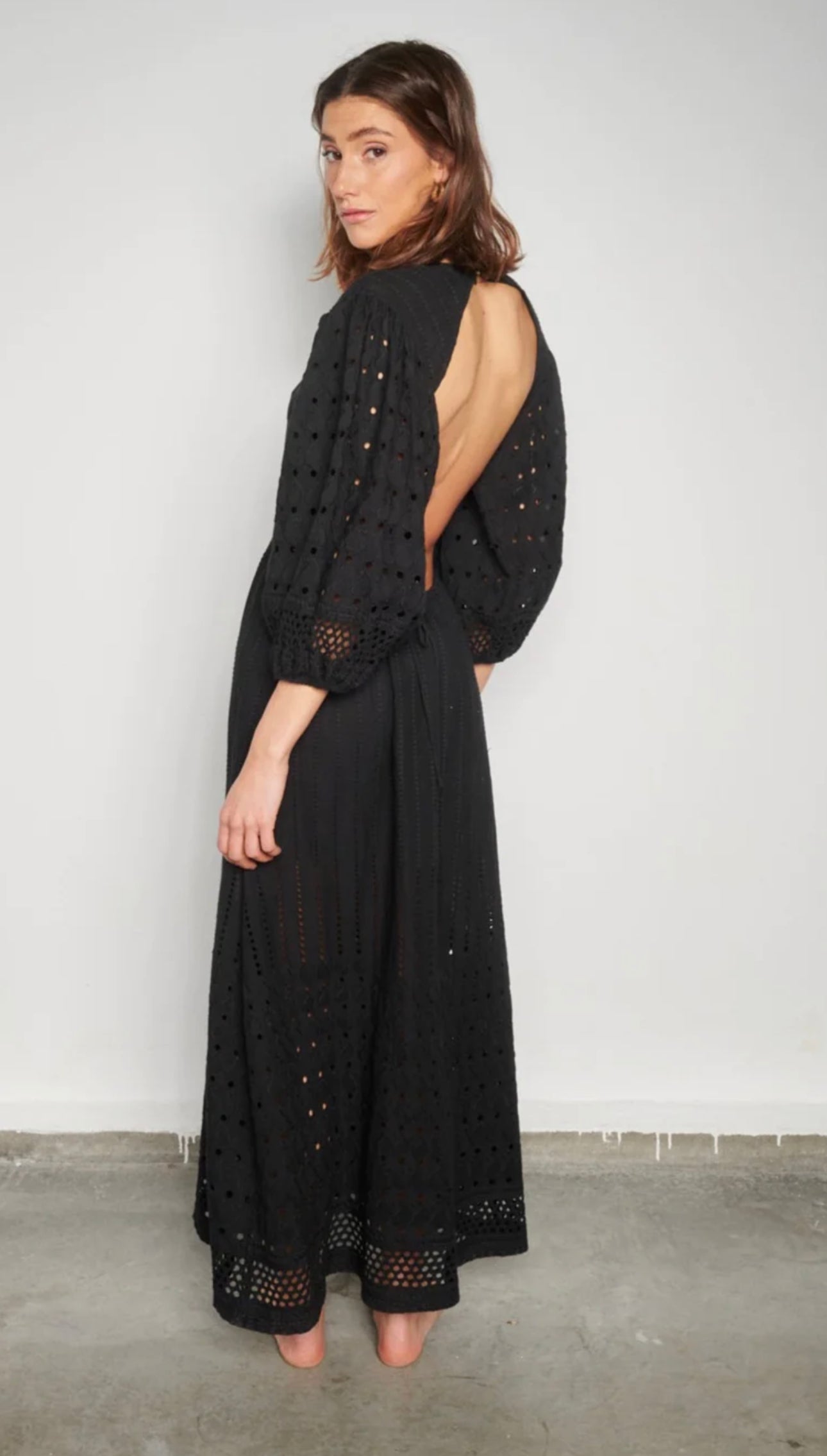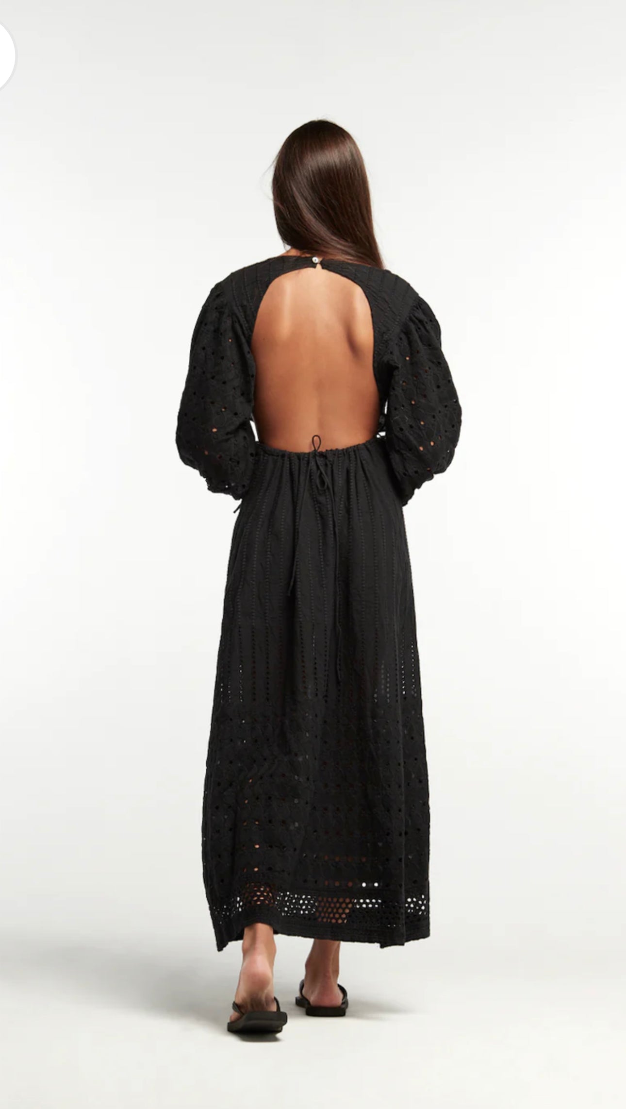 Vestido largo con espalda abierta, regulable en cintura y mangas abullonadas.
