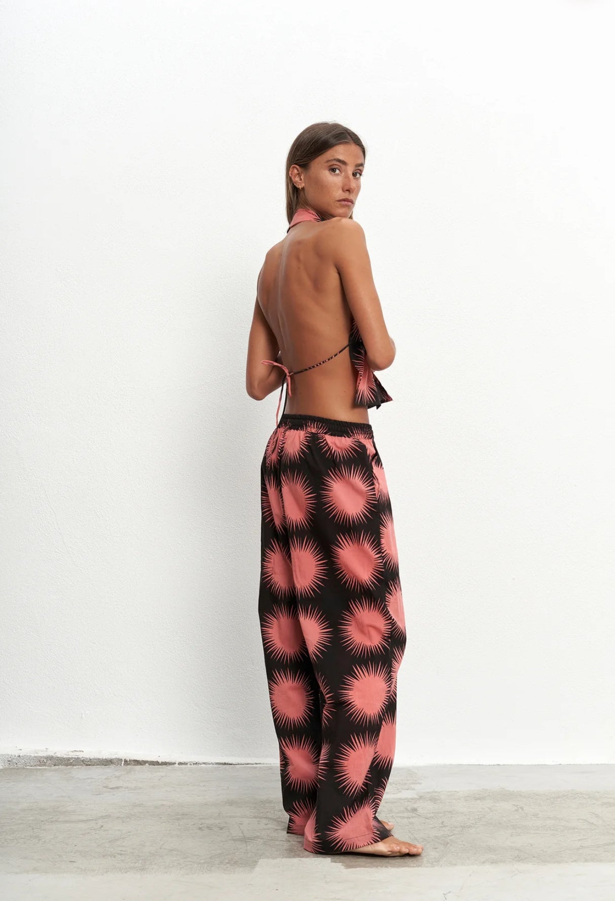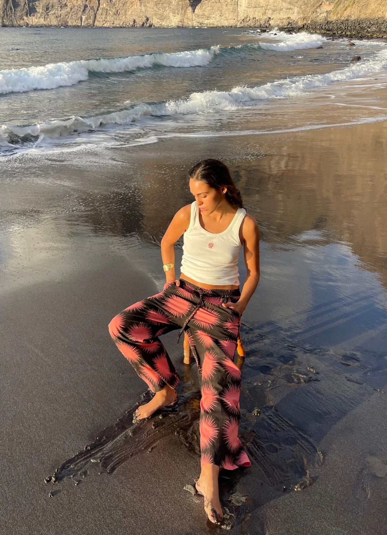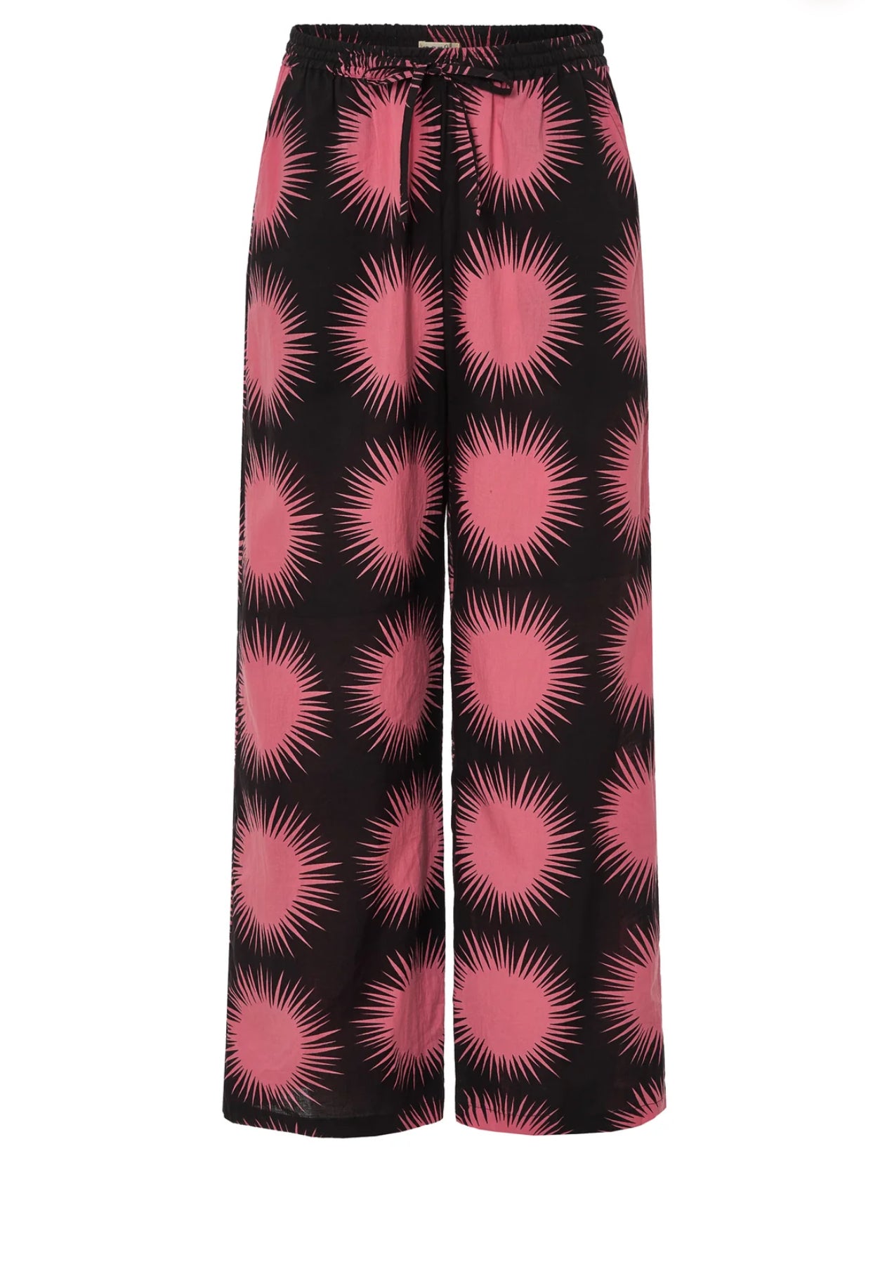 Estampado Block Print de soles en tonos rosas y fondo negro con tintes naturales.