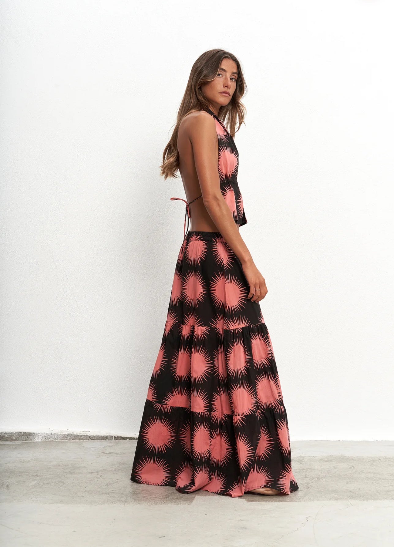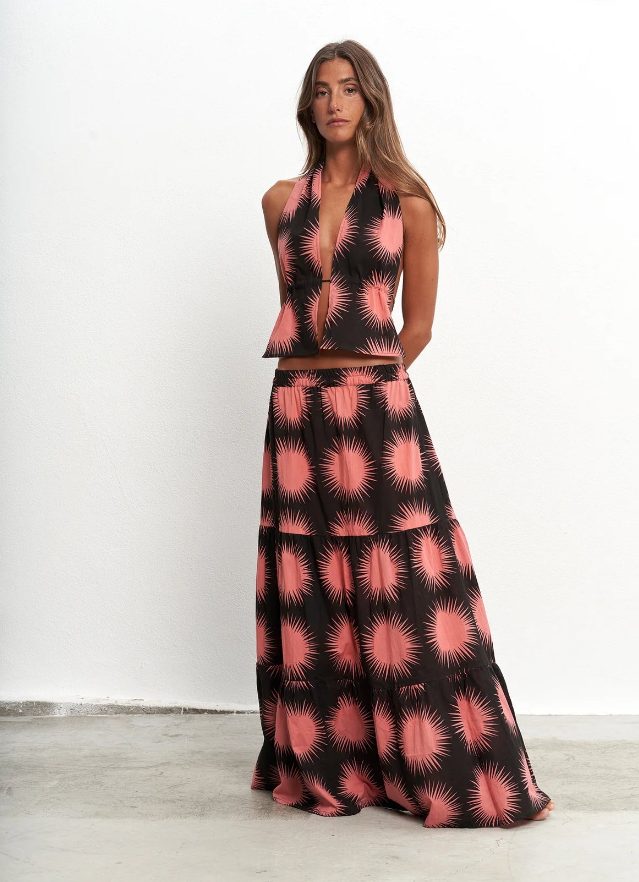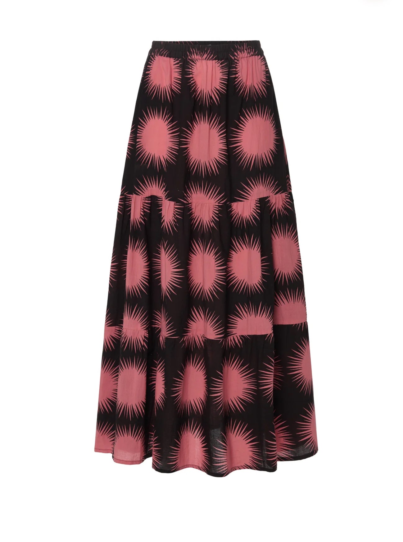 Falda larga con goma en cintura estampado Block Print de soles rosas con tintes naturales en base negra