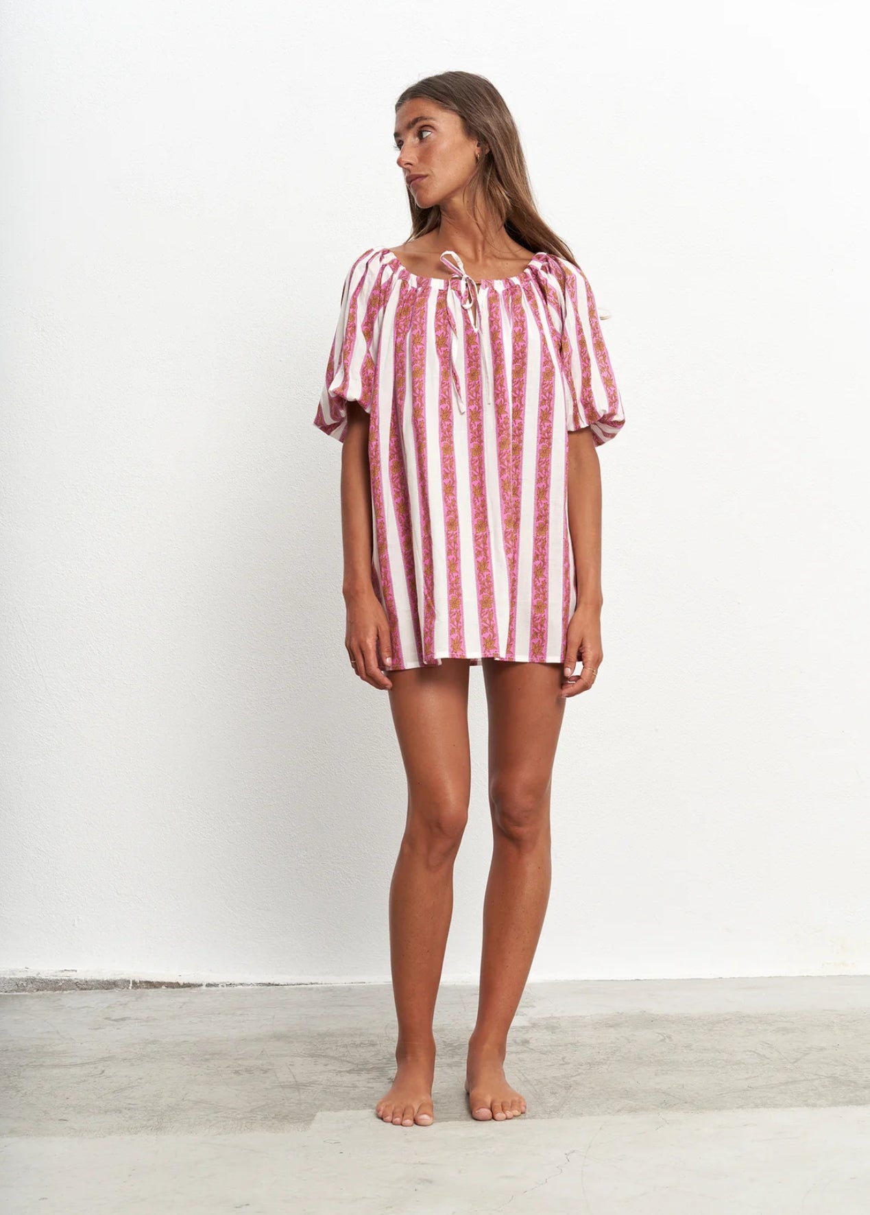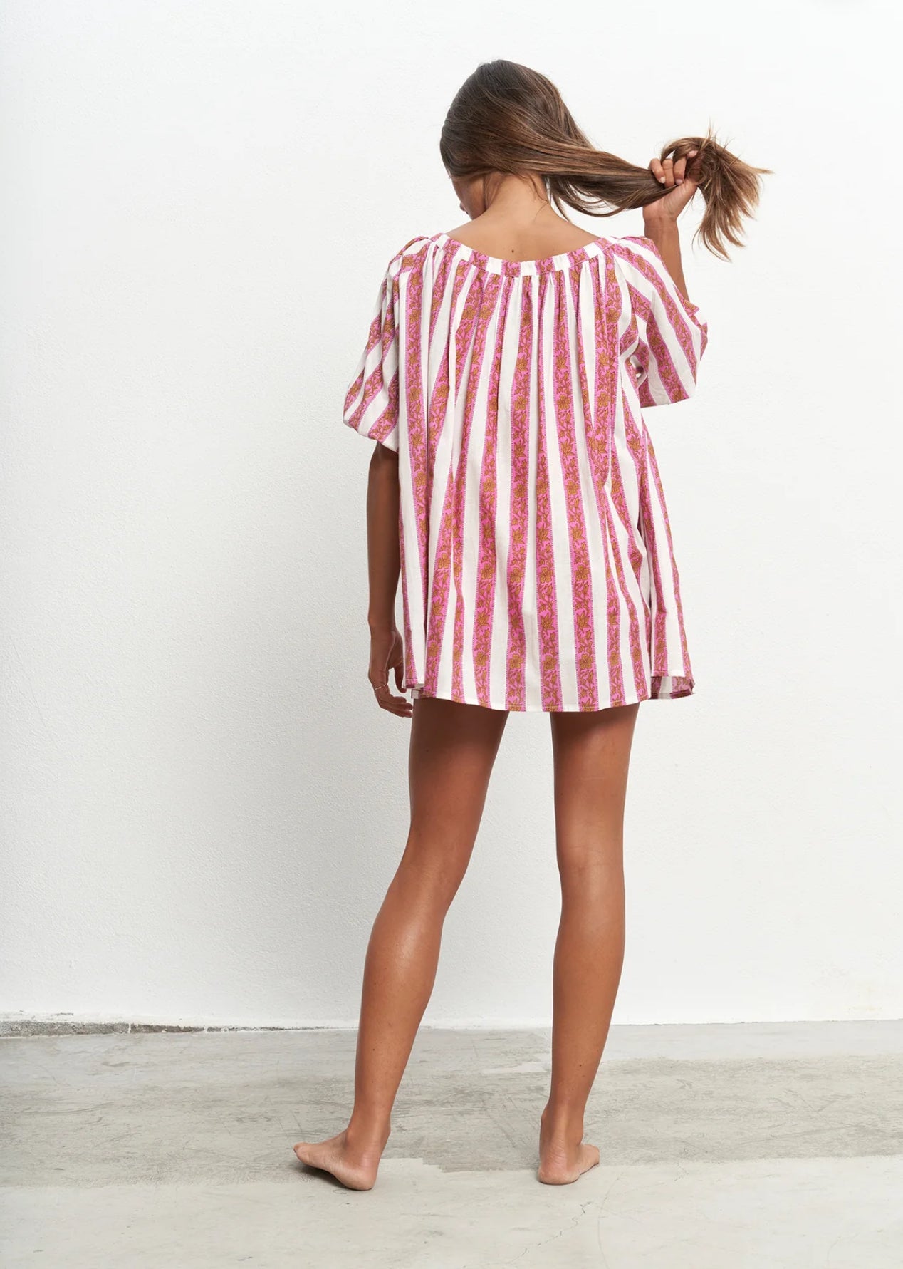 Camisa oversize con cordón ajustable en el cuello y estampado Block Print de flores y rayas en fucsia en base blanca 🩷🤍