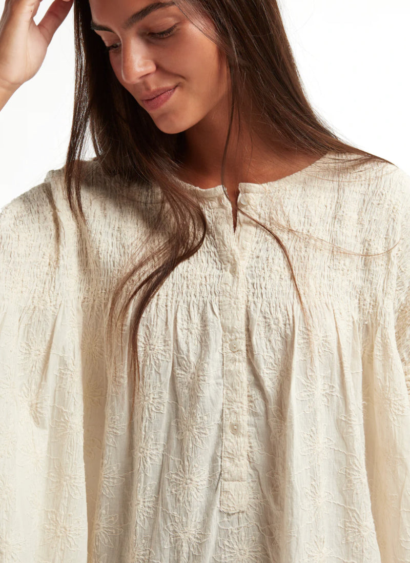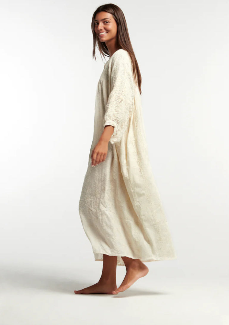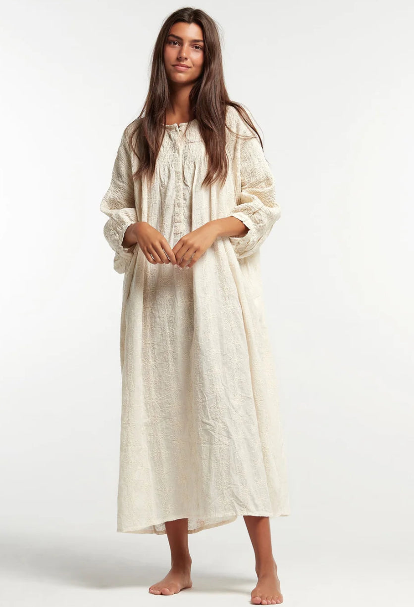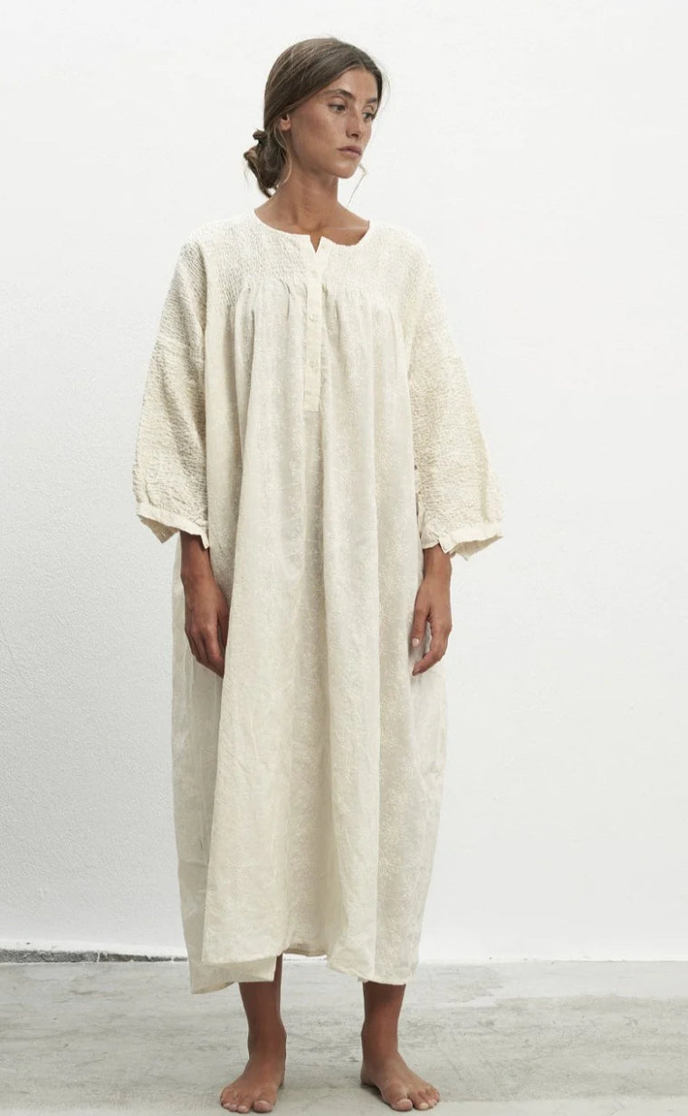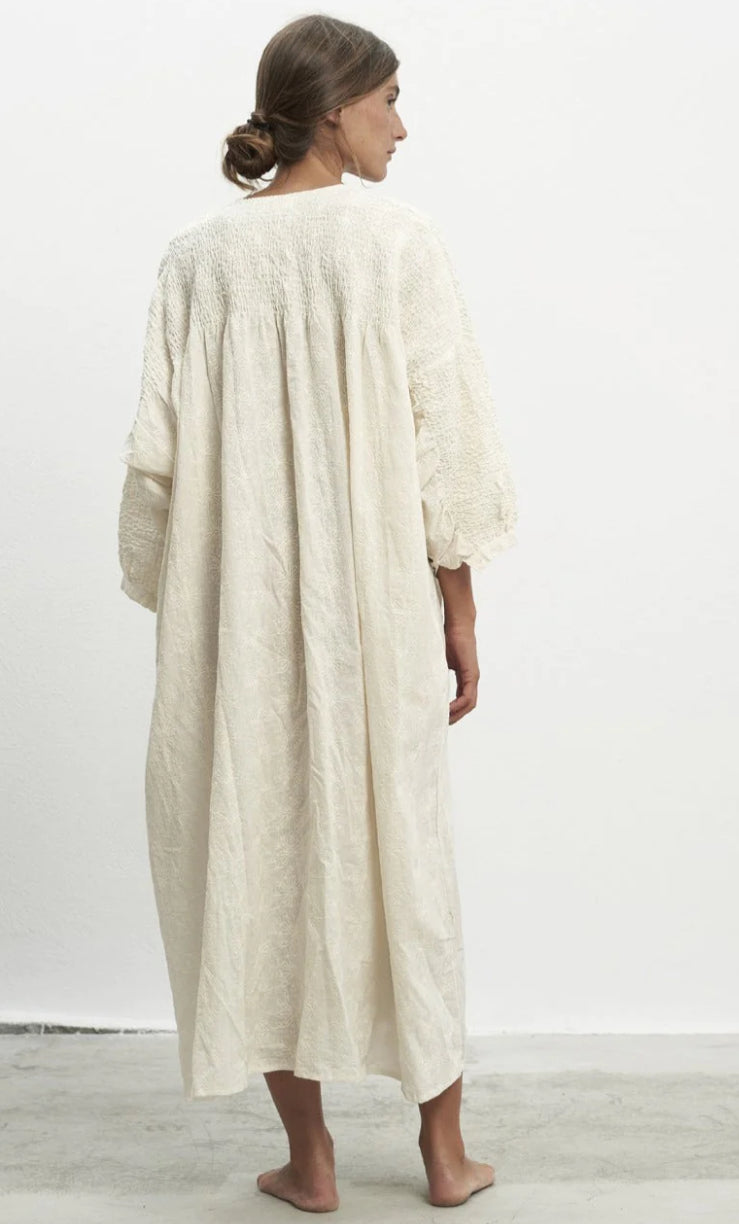 Maxi vestido abotonado con nido de abeja en pechera y mangas