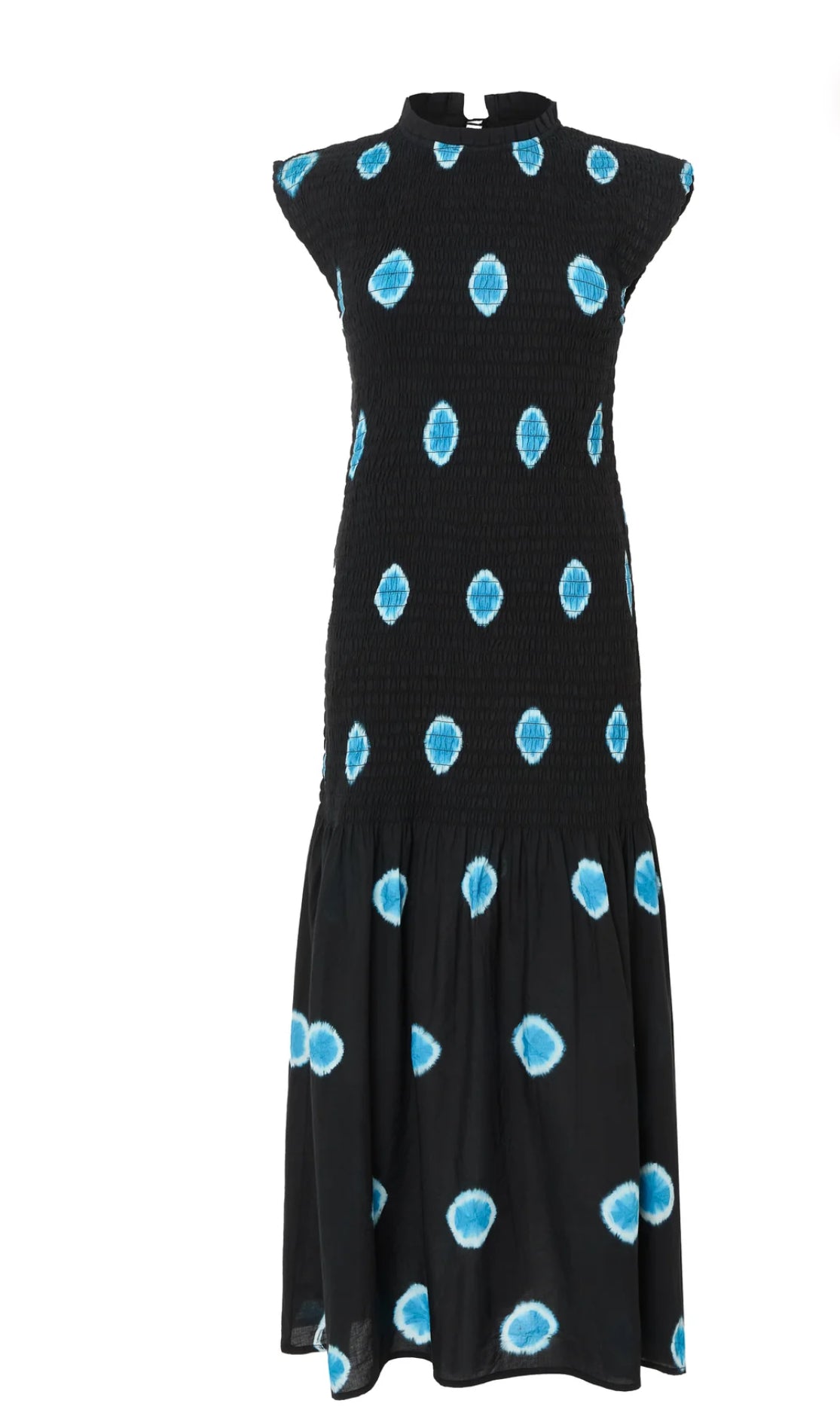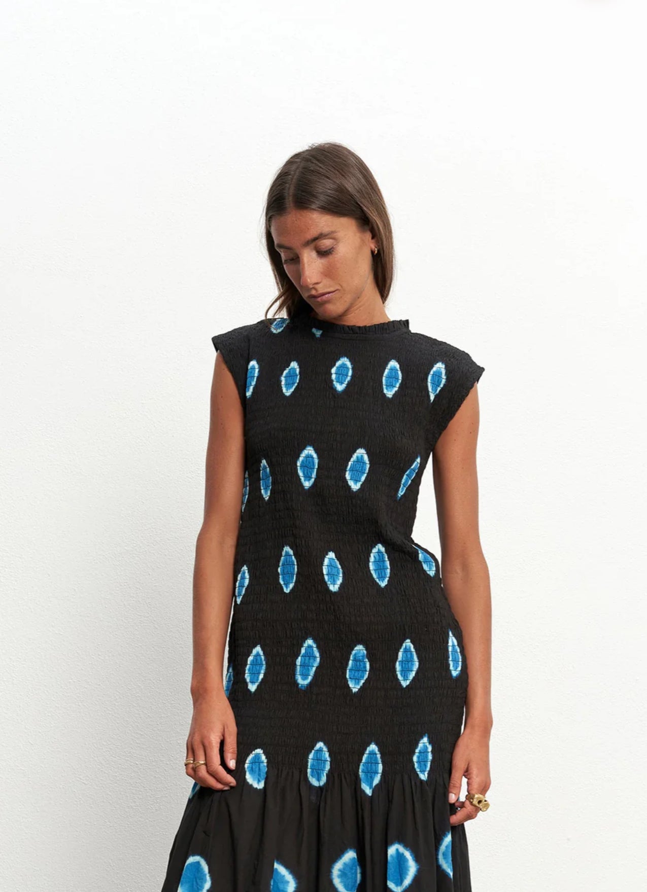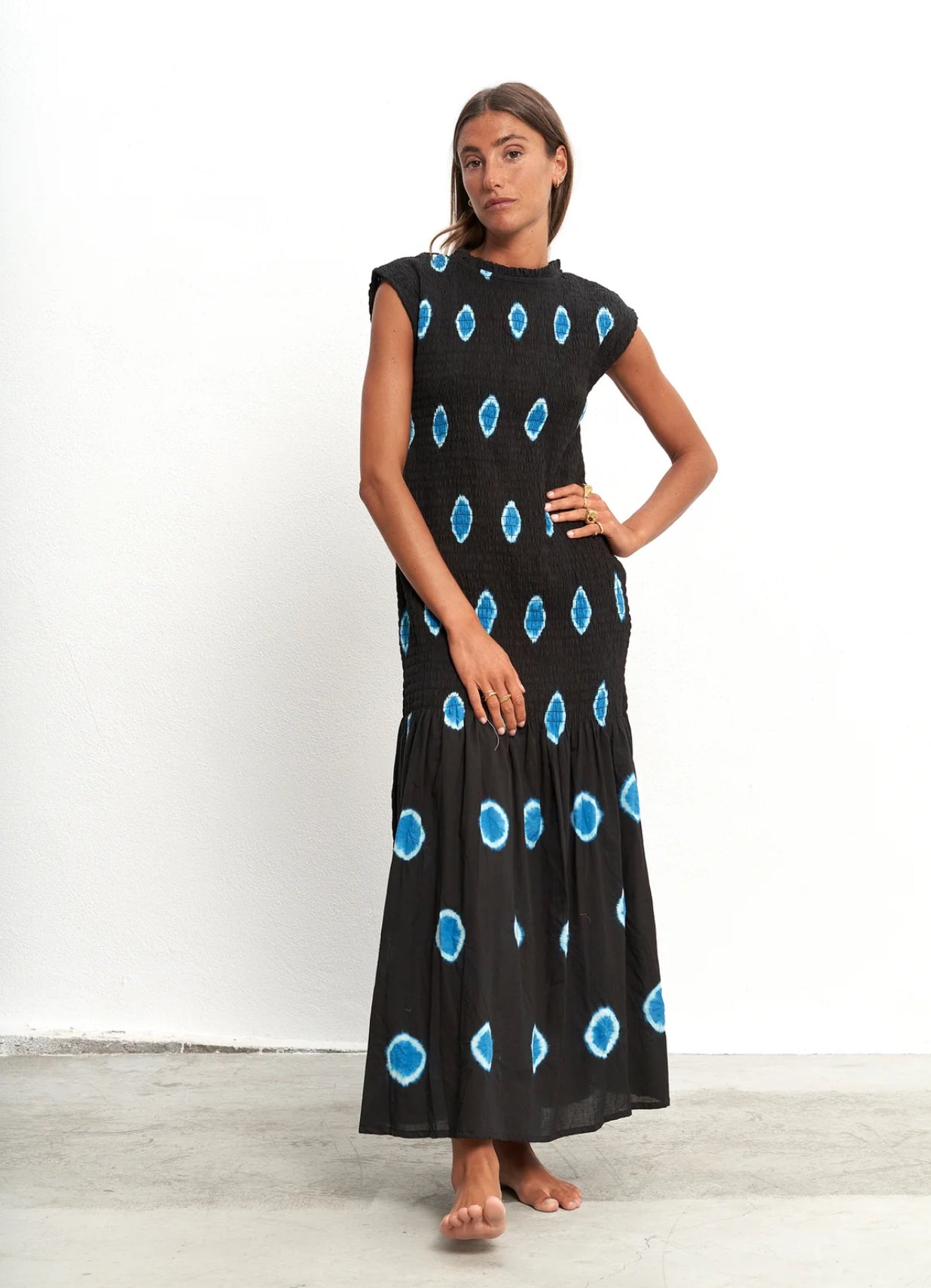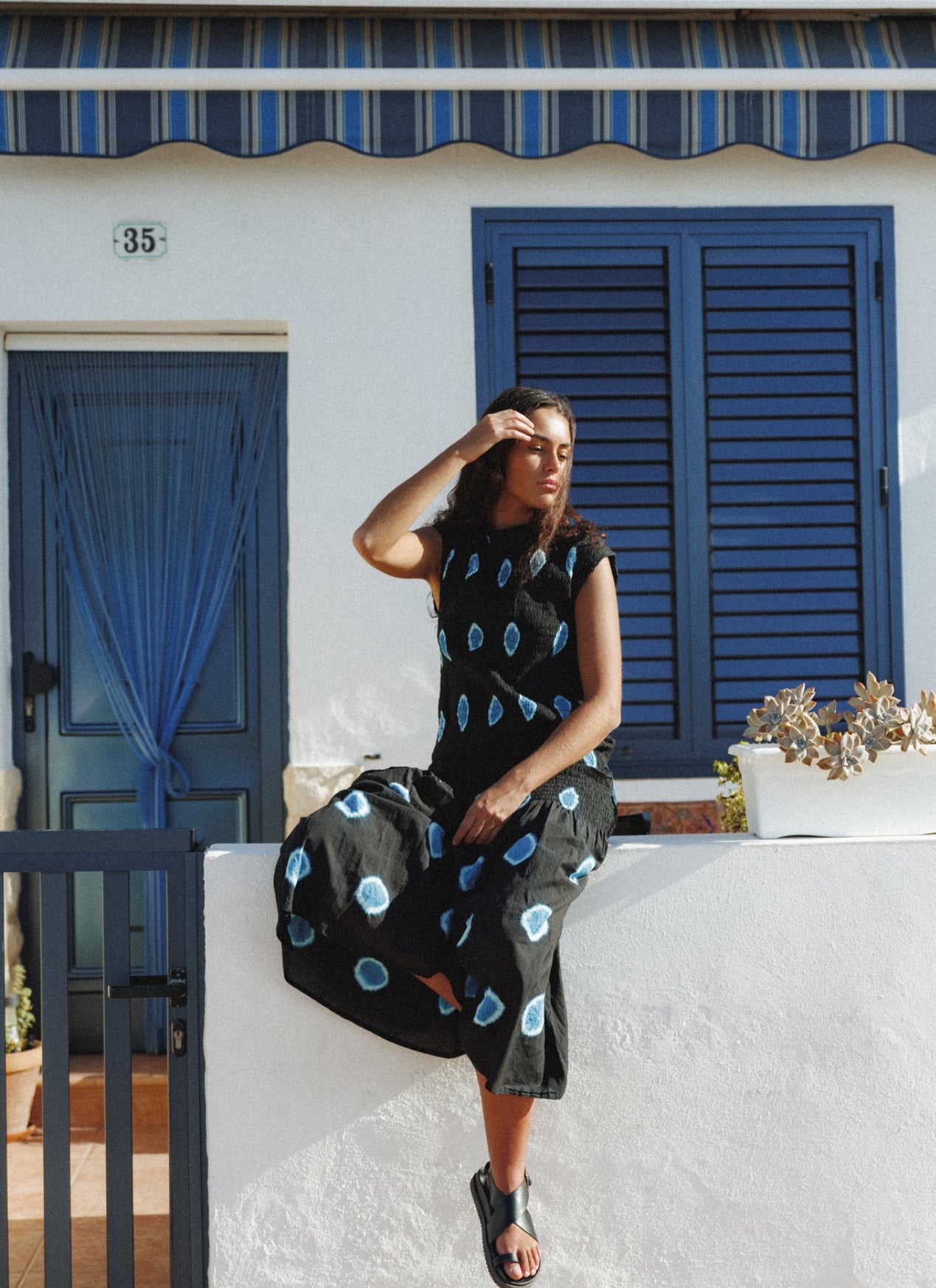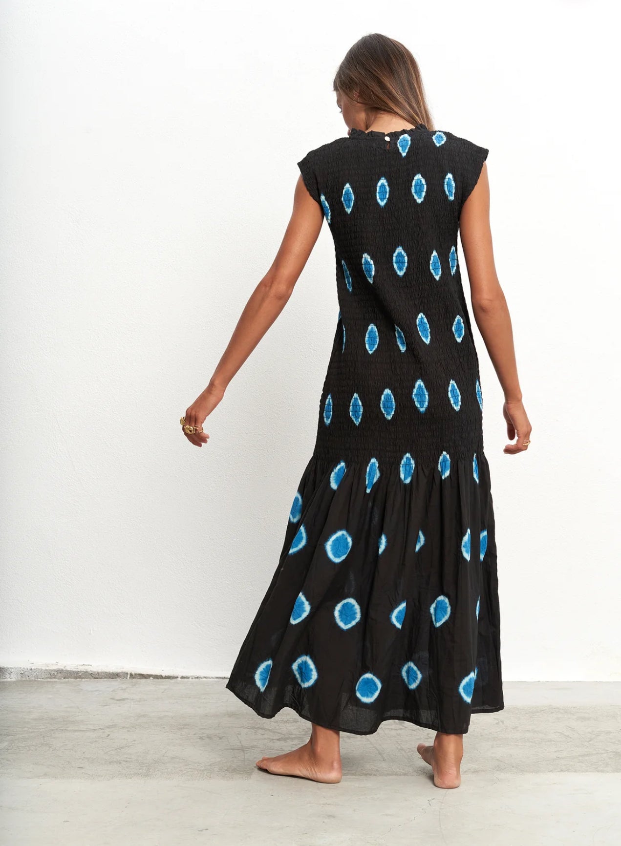 Vestido largo con nido de abeja hasta debajo de la cadera realizado con la técnica manual de shivory con tintes naturales en color negro con detalles azules🌊