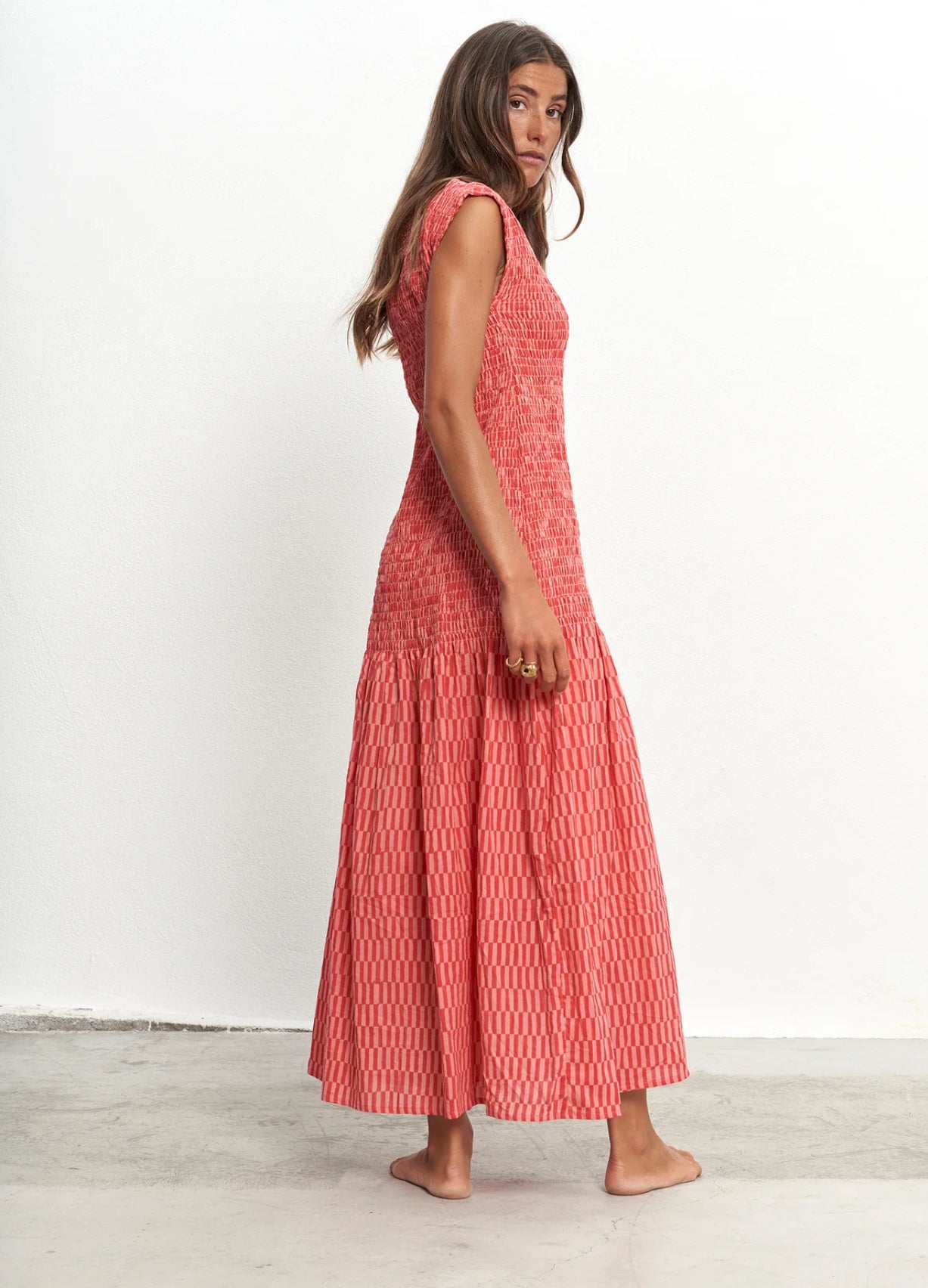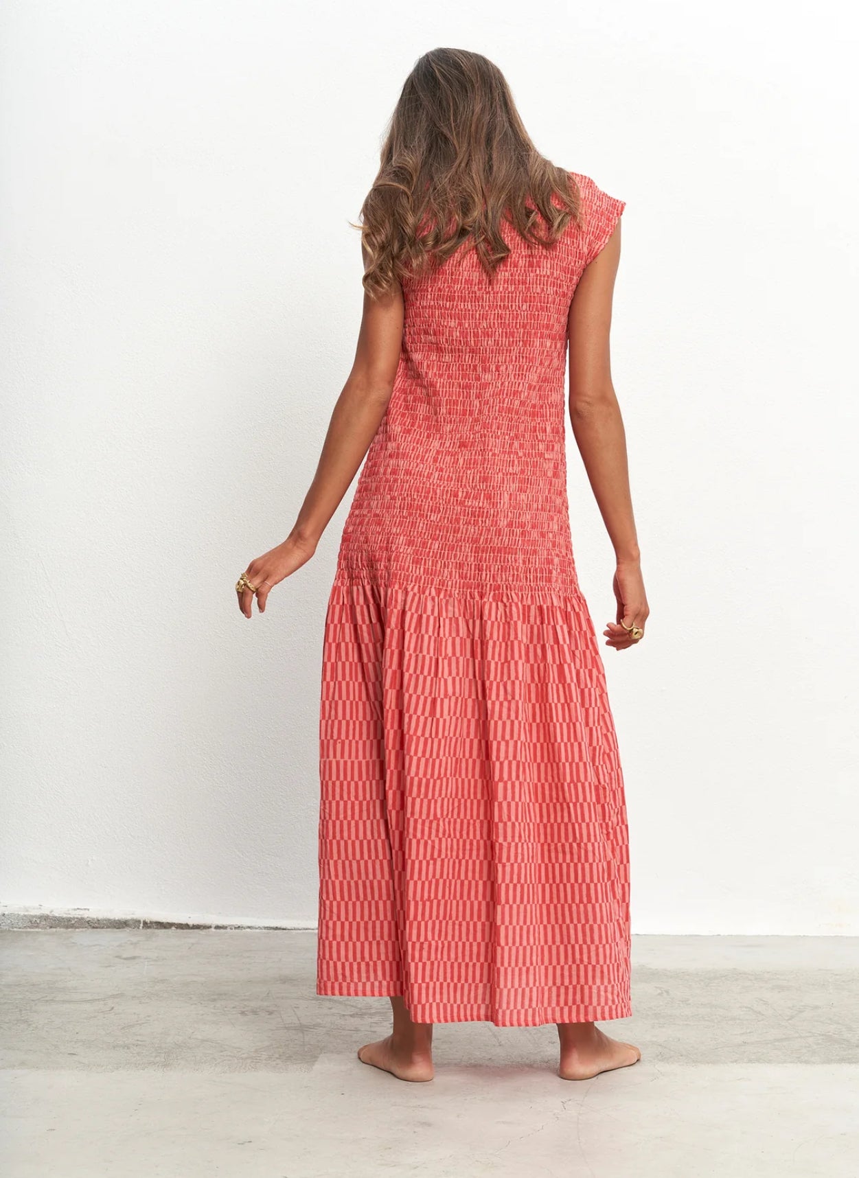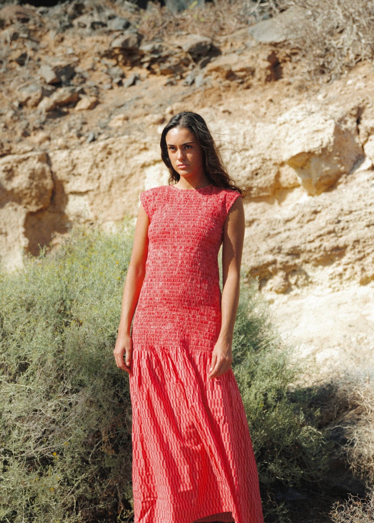 Vestido largo con nido de abeja hasta debajo de la cadera con estampado block print damero rosas y rojos 💗❤️