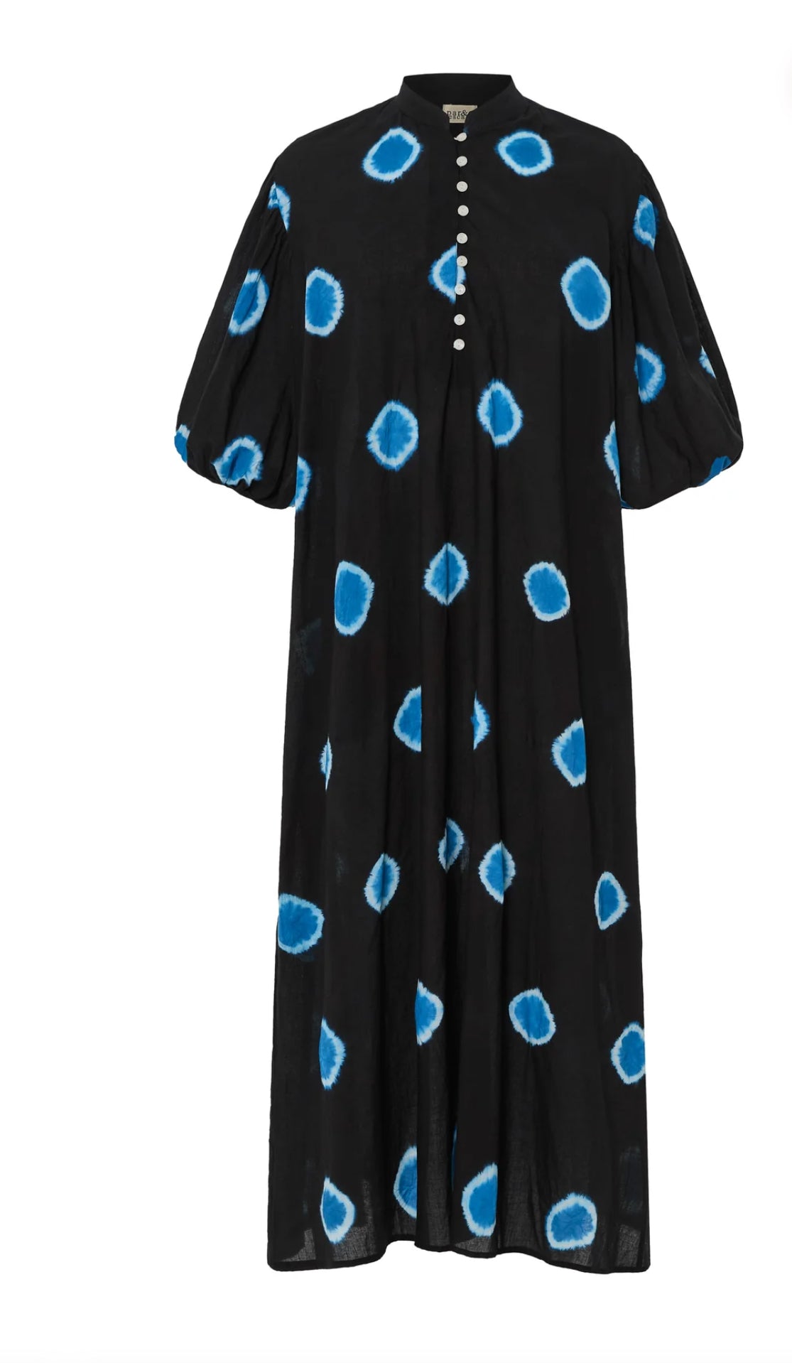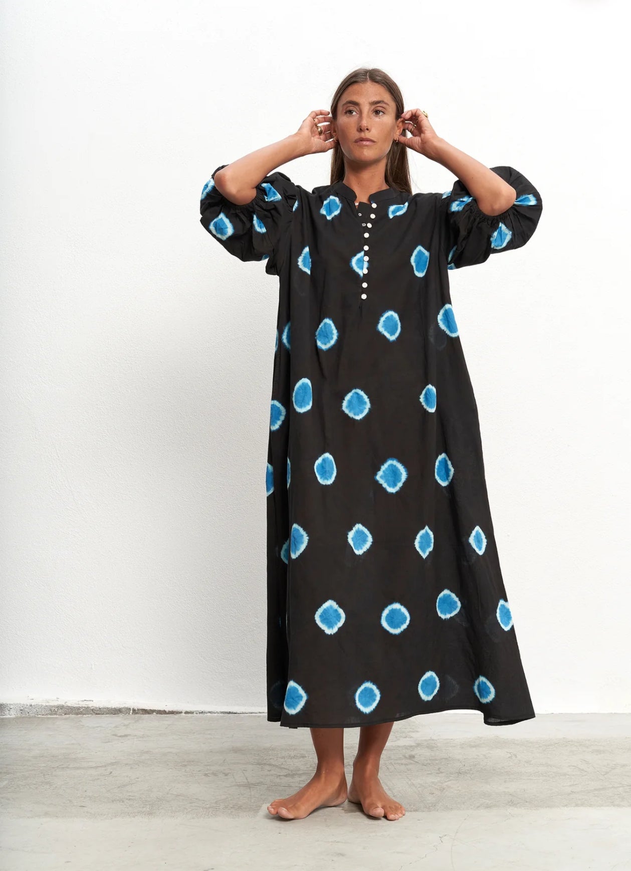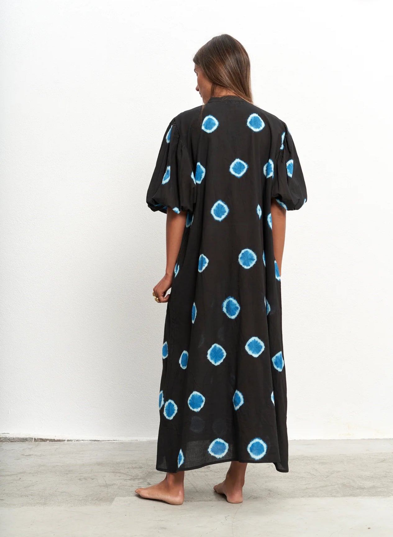 Vestido largo con manga abullonada y bolsillos realizado con la técnica manual de shivory con tintes naturales en color negro con detalles azules🌊