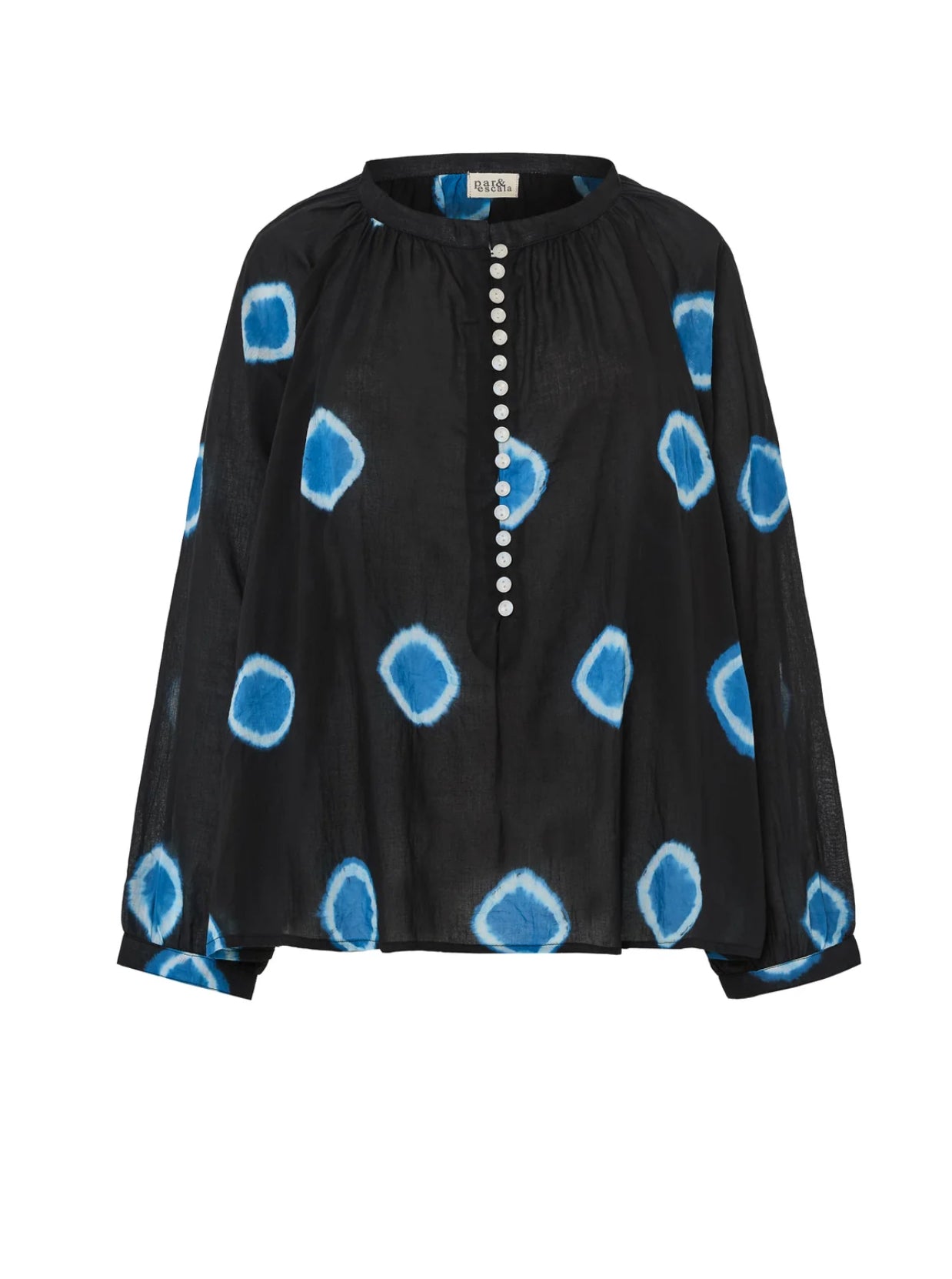 Camisa manga larga con botones de nácar realizada con la técnica manual de shivory con tintes naturales en color negro con detalles azules