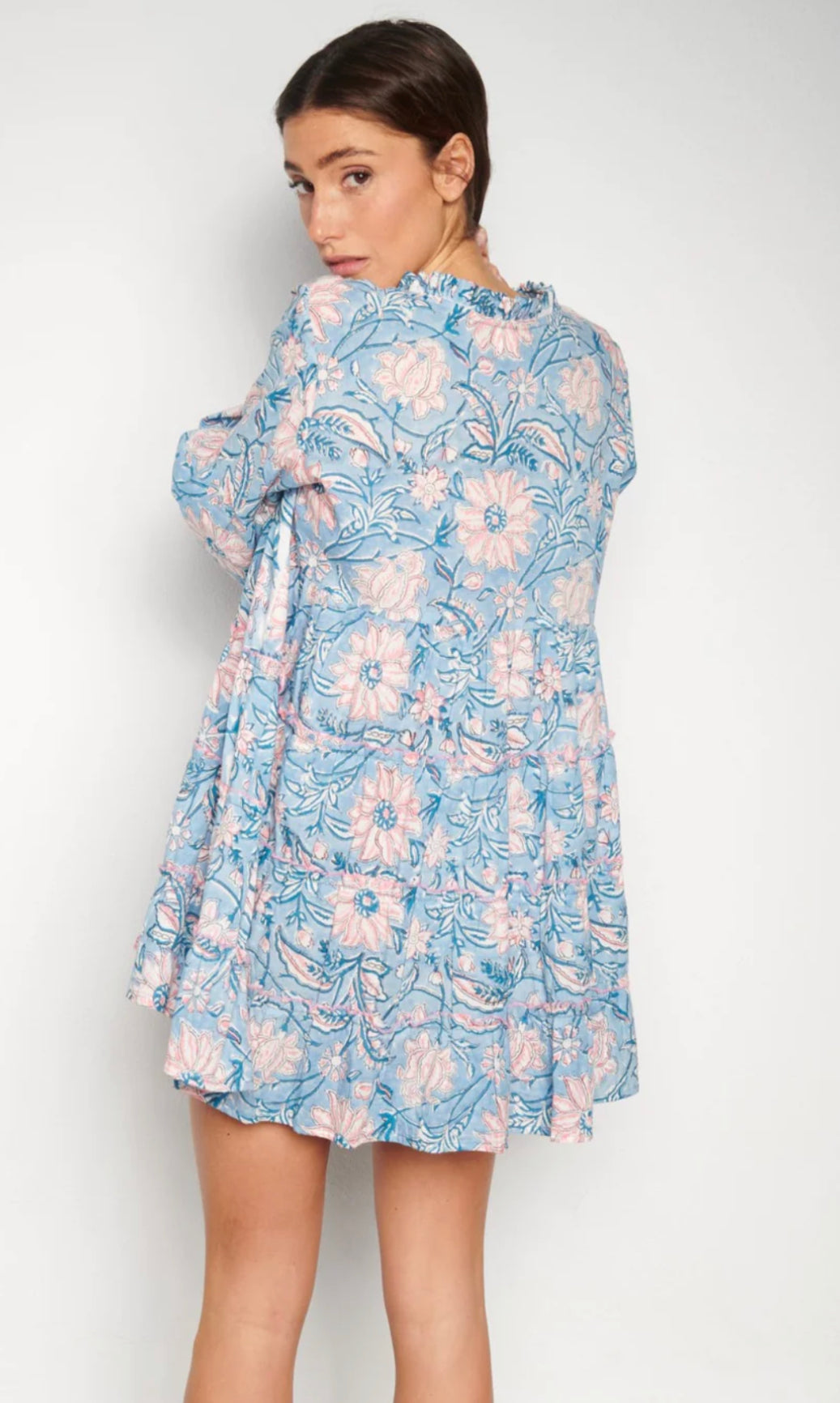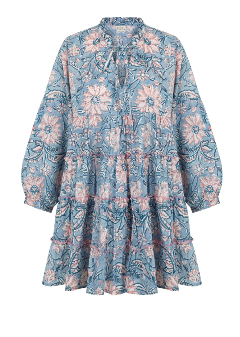 Vestido corto y amplio con escote pico y volantito fruncido. Estampado Block print con base celeste y flores blancas y rosas.