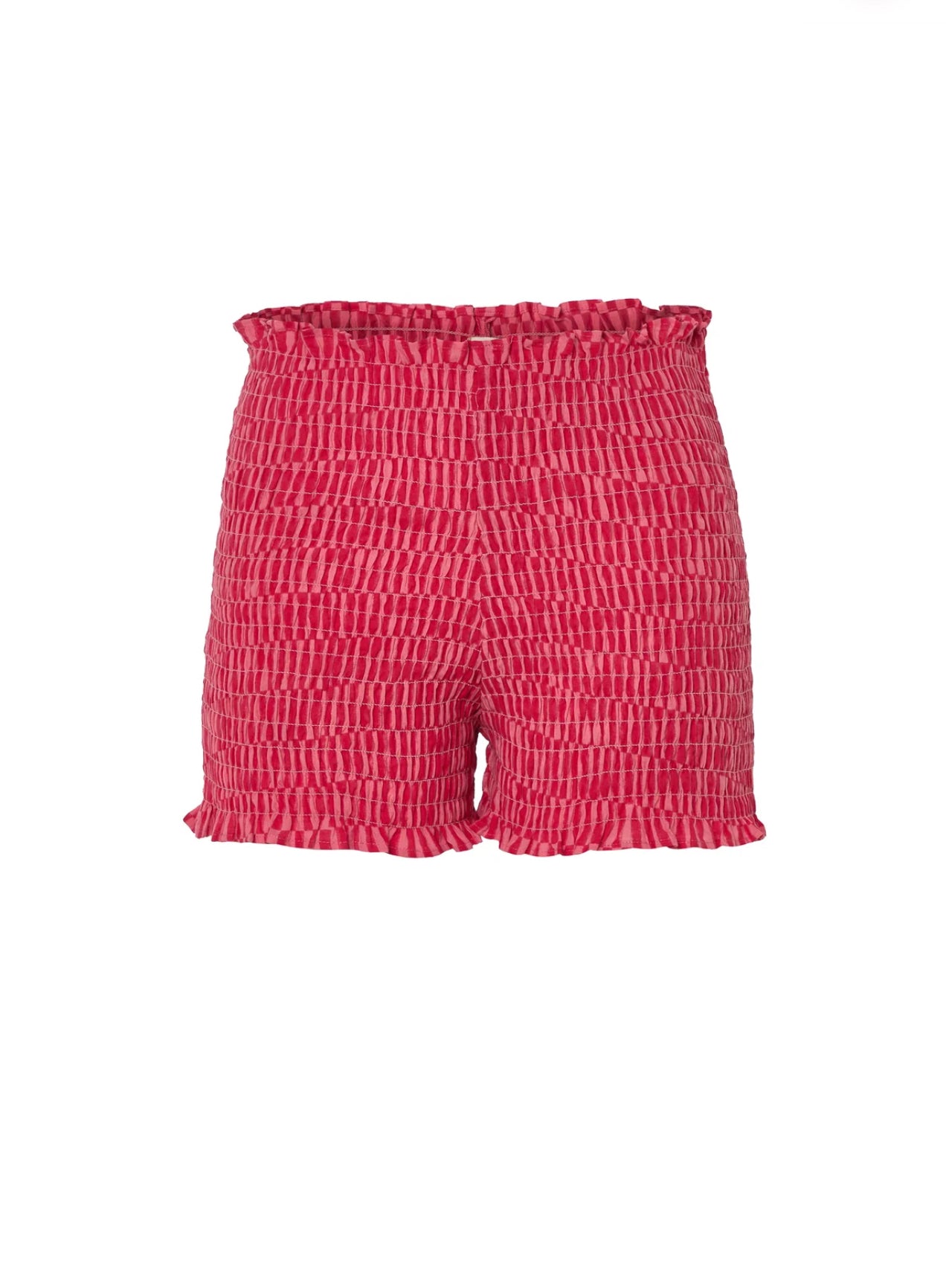 Pantalon corto con nido de abeja estampado block print damero en rosas y rojos con detalles de volantes en los bordes 🍒