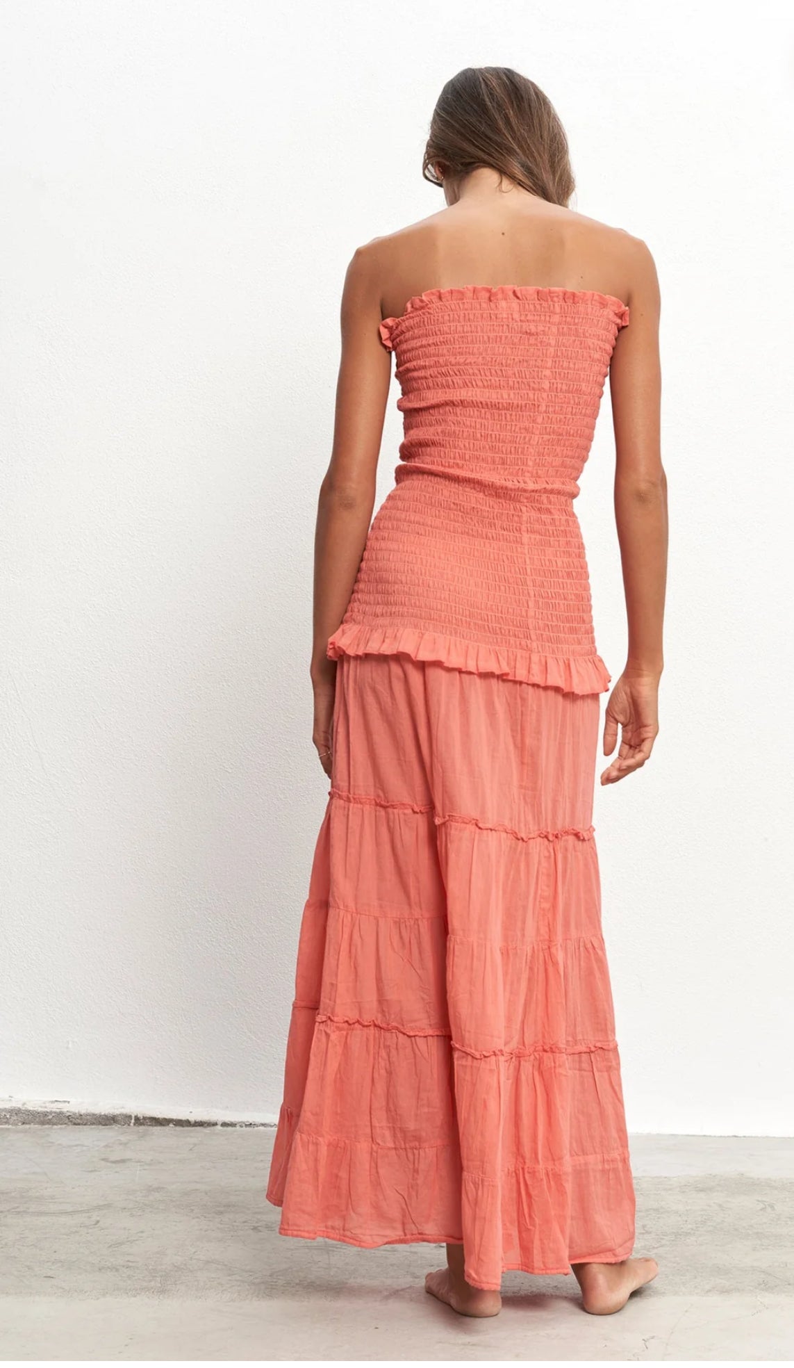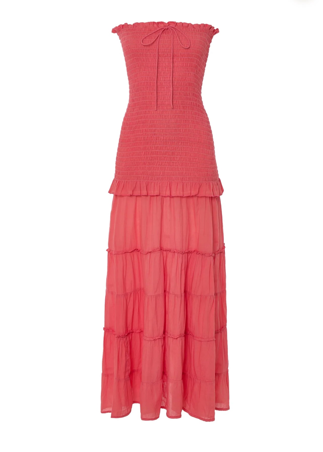 Vestido largo palabra de honor de nido de abeja y volantes en color rosa con tintes naturales 🪸