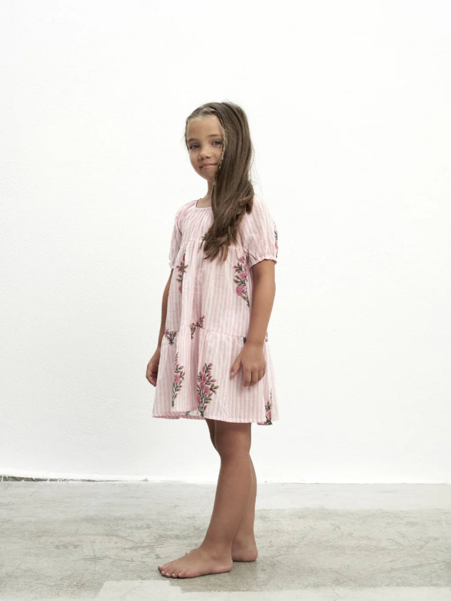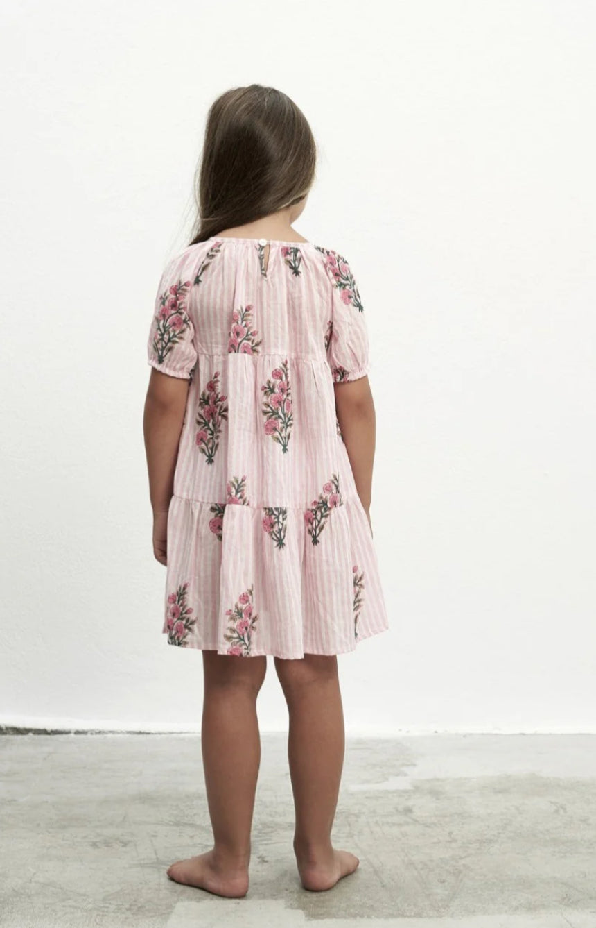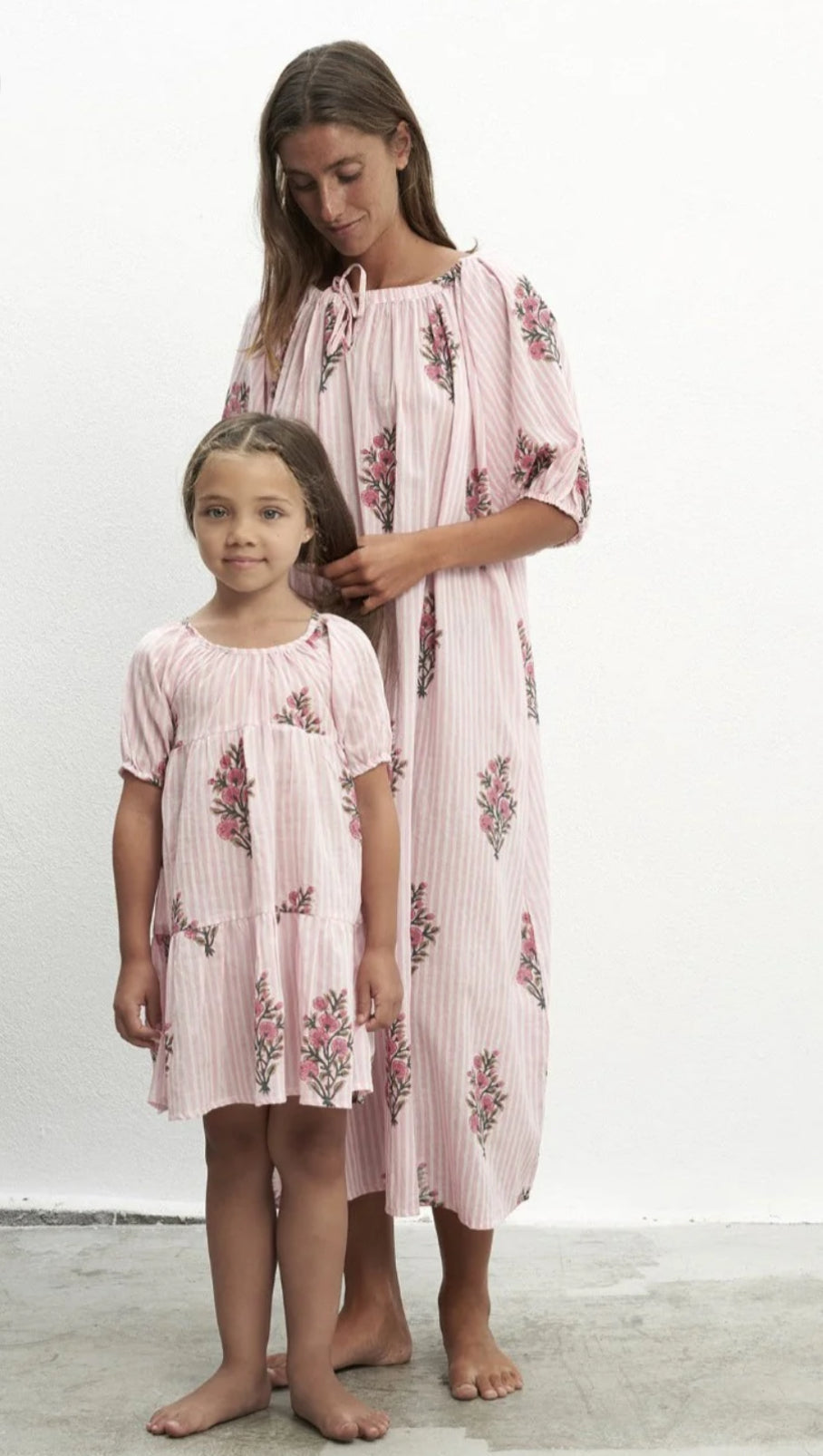 Estampado Block Print de rayas y flores en tono rosa y mostaza con tintes naturales.