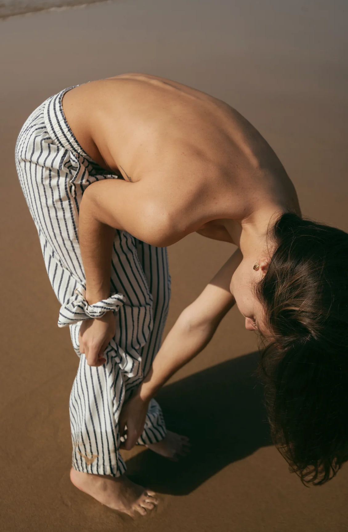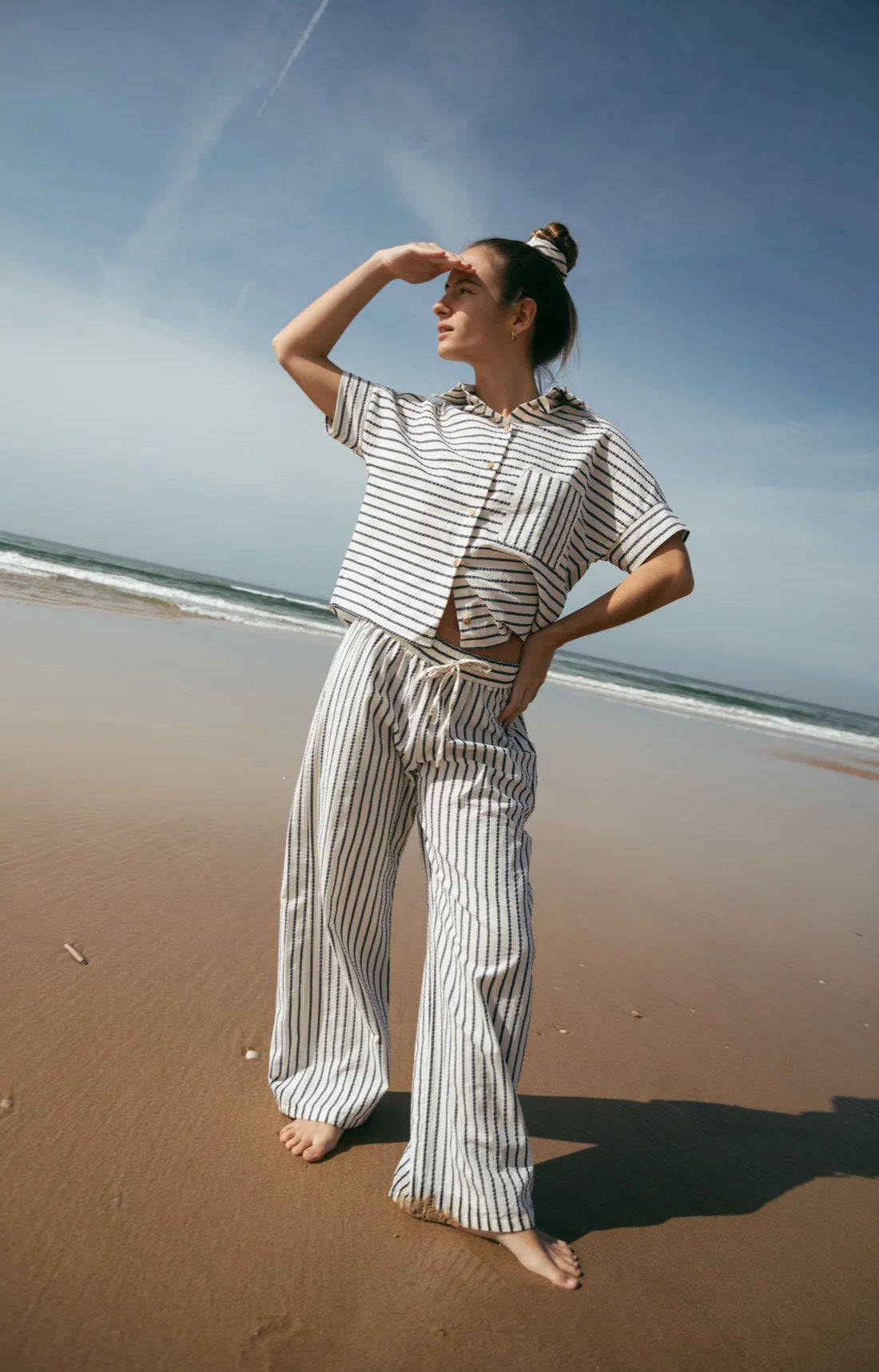 quien no necesita un scrunchie para atar el cabello en todo momento del día? Y que mejor con ese tejido de algodón a rayas y su puntilla que embellece donde la póngas.
