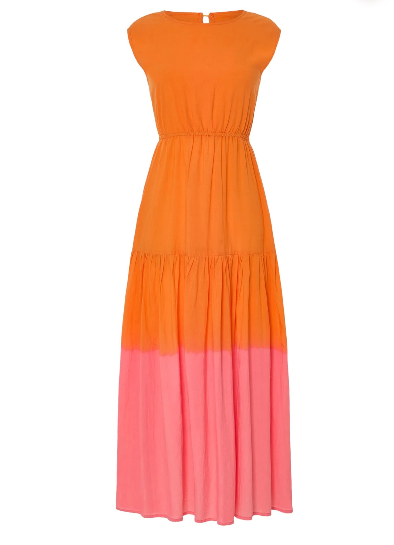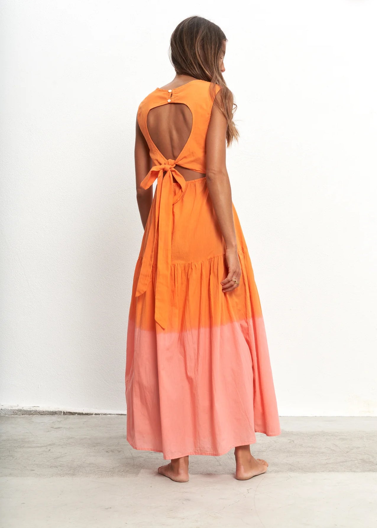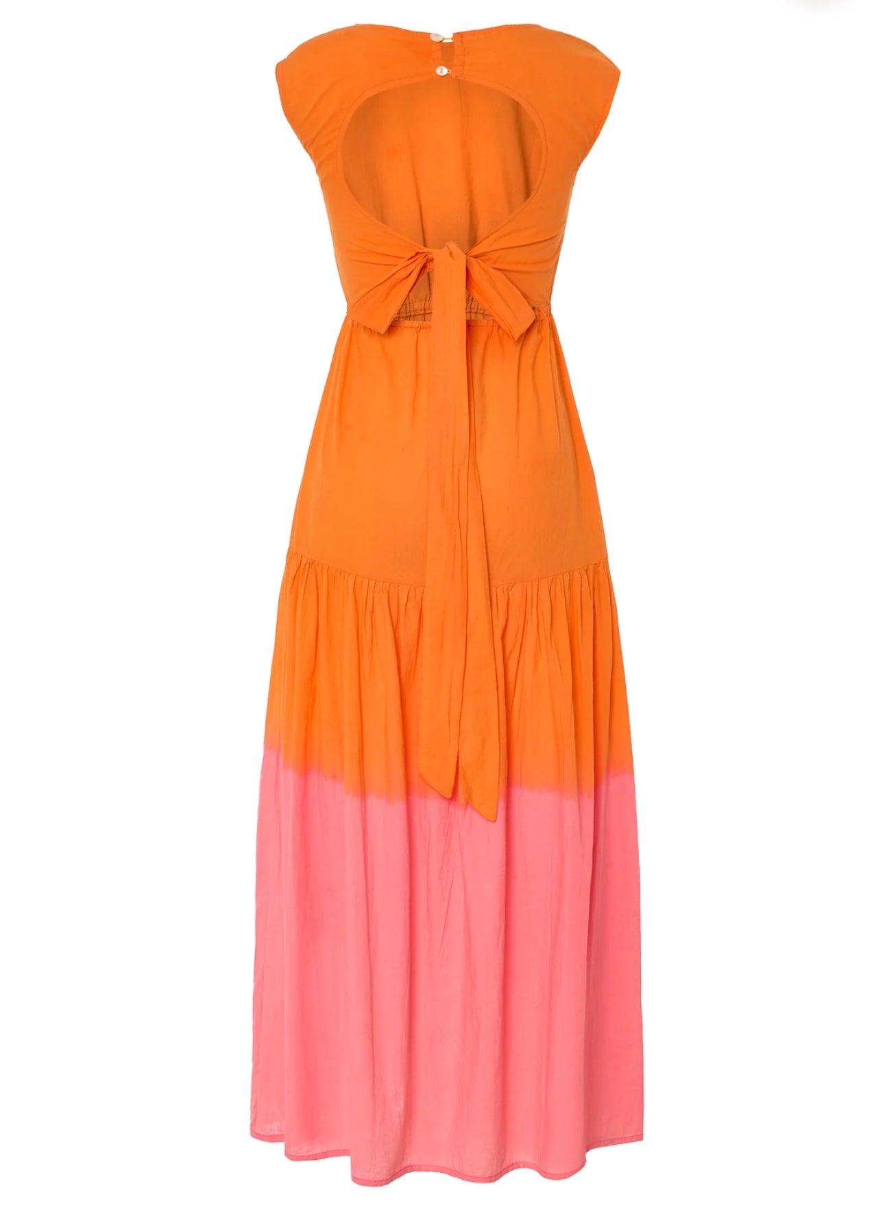 Vestido largo con espalda abierta y lazada ajustable con teñido tie dye en naranja y rosa con tintes naturales🧡🩷